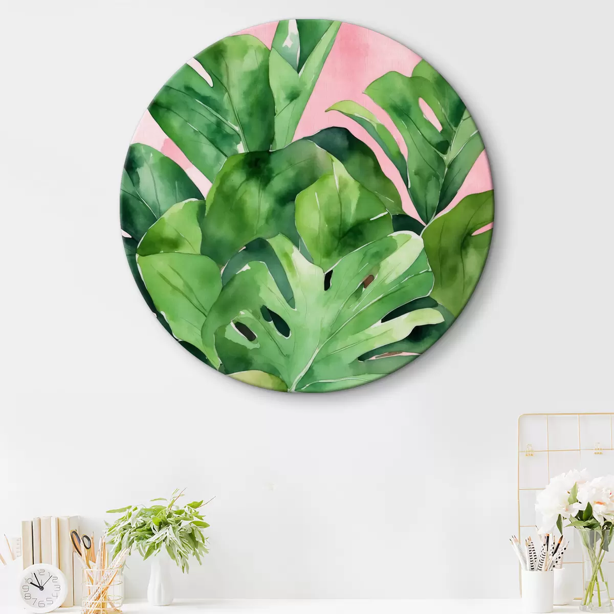 Tableaux rondes Feuilles tropicales sur fond rose Nr r39870