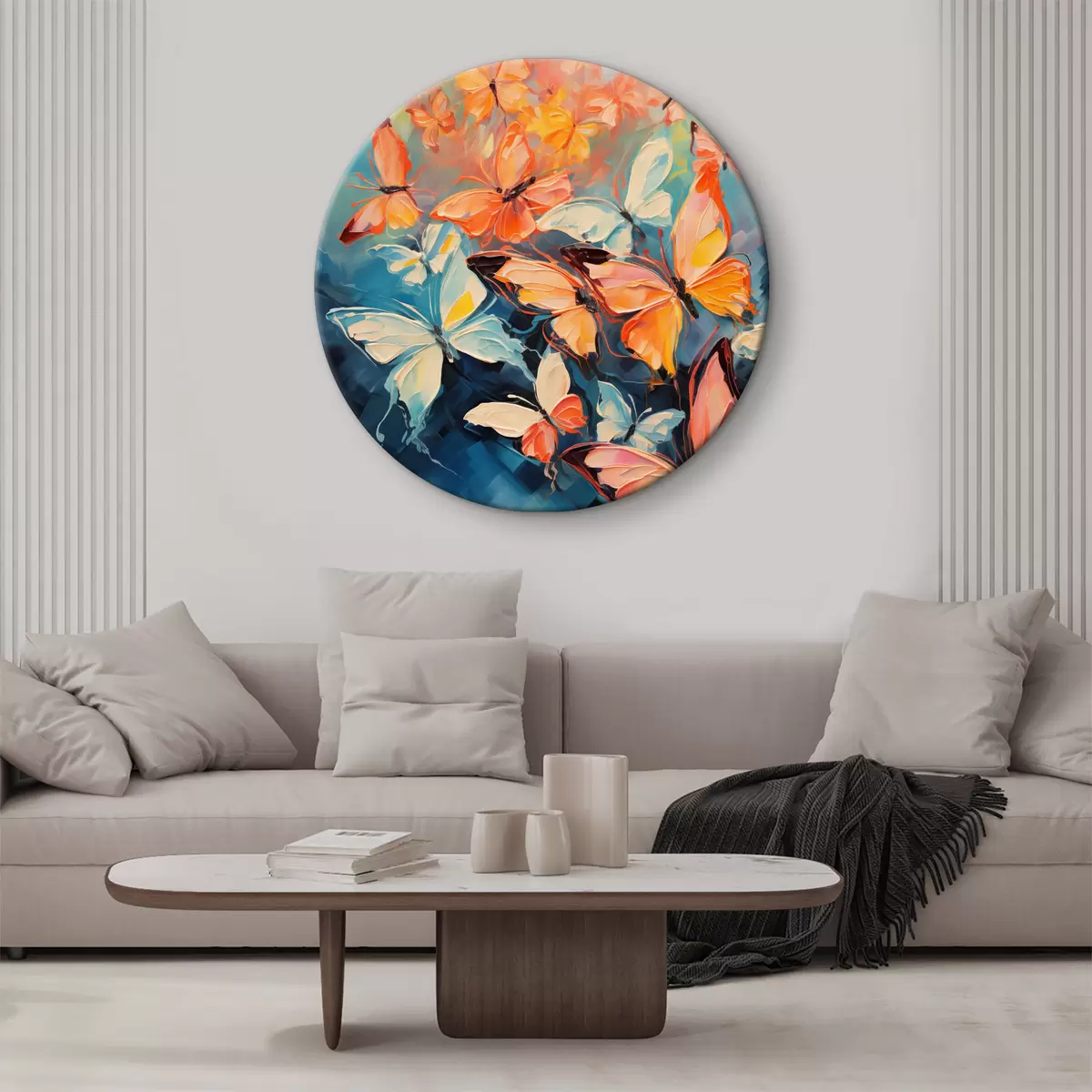Tableaux rondes Un vol de papillons volant sur une peinture à l'huile bleue Nr r39922