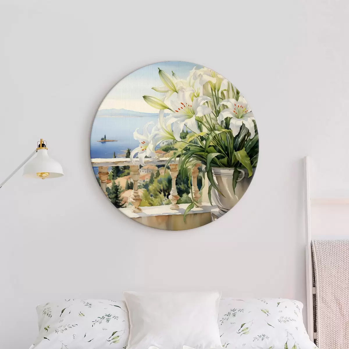 Tableaux rondes Lys blancs dans un pot sur un balcon sur fond d'aquarelle de la baie Nr r39932