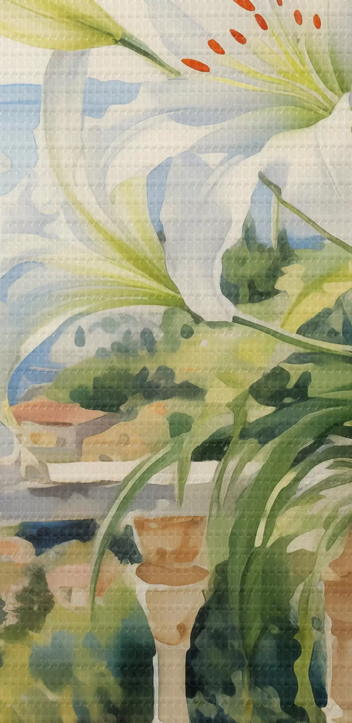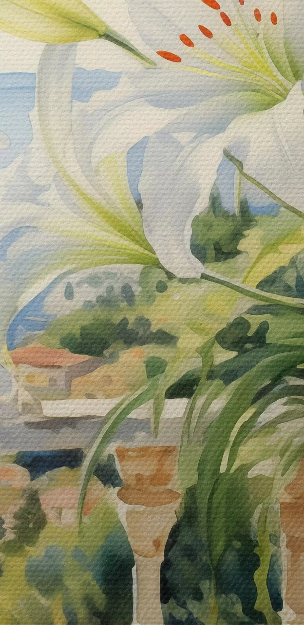 Tableaux rondes Lys blancs dans un pot sur un balcon sur fond d'aquarelle de la baie r39932
