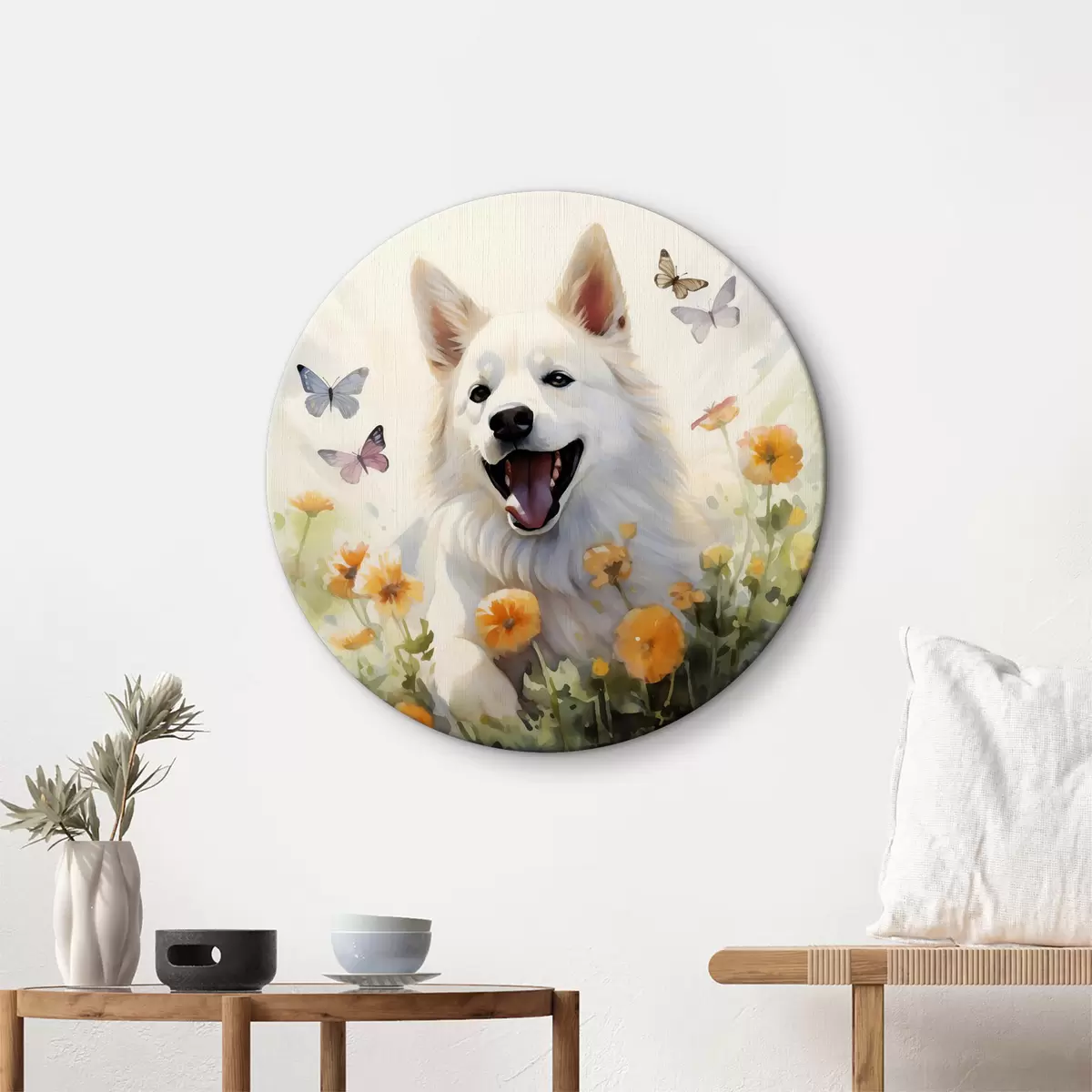 Tableaux rondes Chien blanc assis dans des fleurs, les papillons volent aquarelle Nr r39936