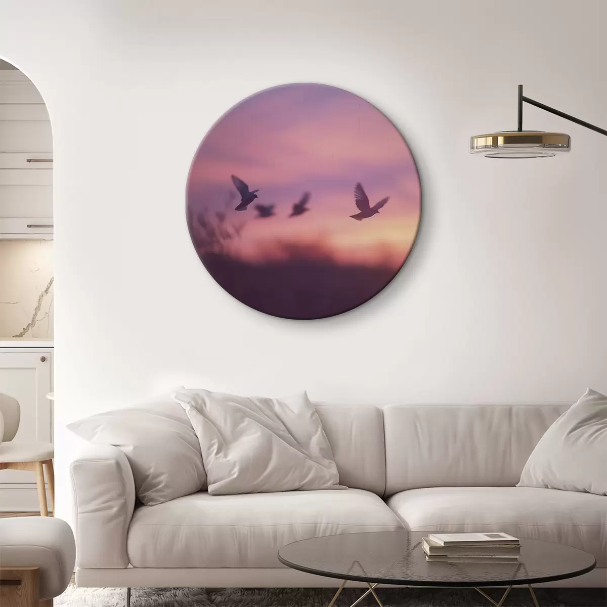 Tableaux rondes Oiseaux en vol, ciel de coucher de soleil violet, paysage naturel, cinématique Nr r39972