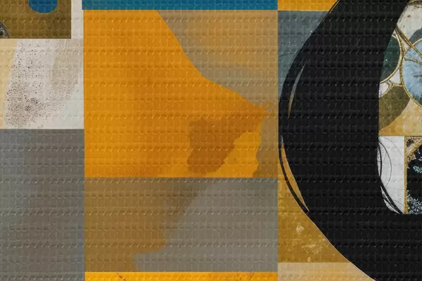 Tableaux rondes Composition géométrique abstraite avec des femmes et diverses formes, textures et couleurs r40016