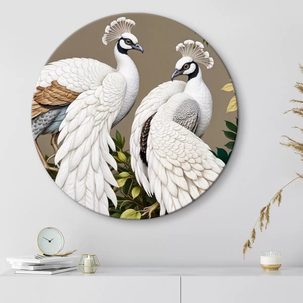 Tableaux rondes Deux paons blancs aux plumes ornées perchés sur une branche avec des fleurs Nr r40022
