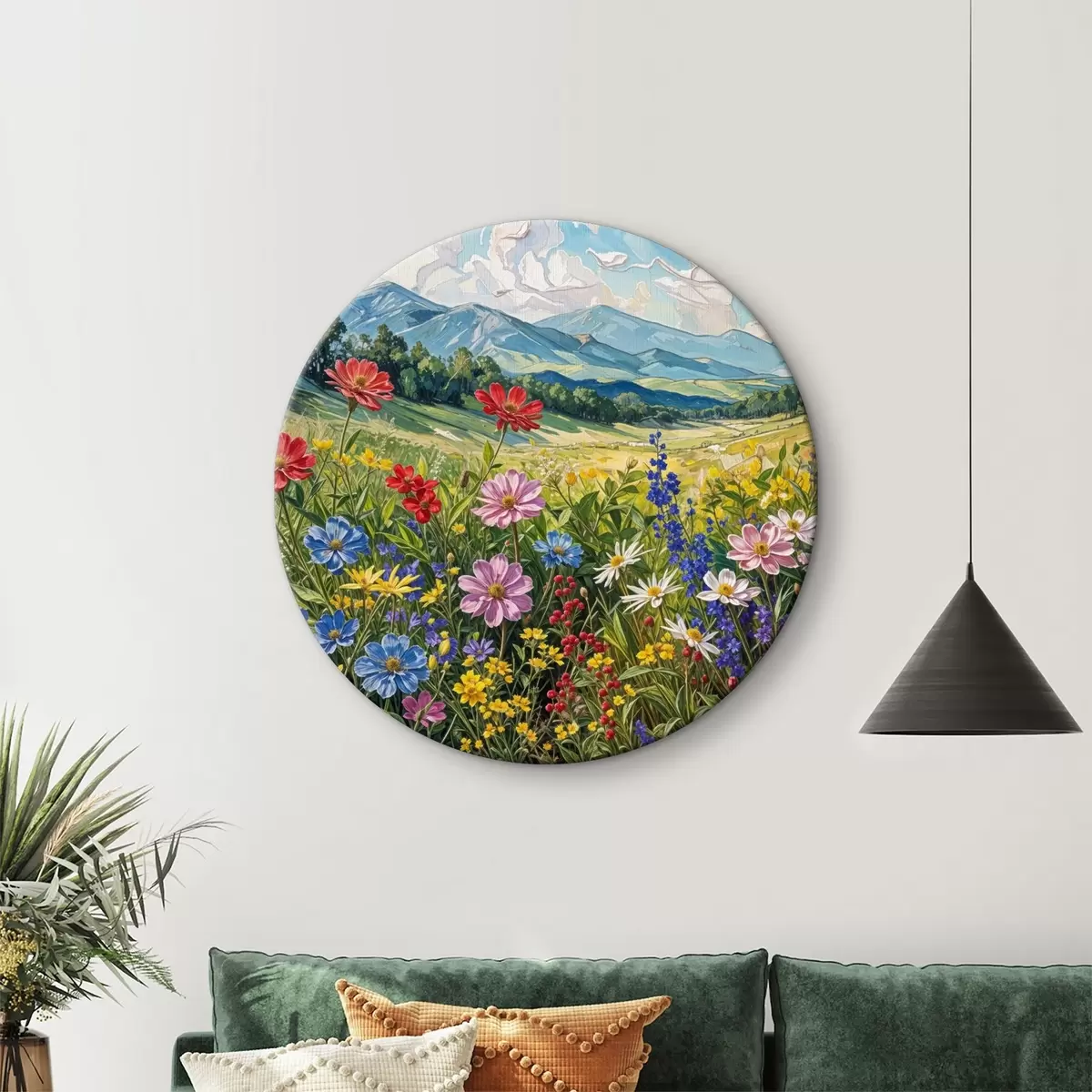 Tableaux rondes Un champ vibrant de fleurs sauvages colorées en fleurs sur fond de collines et de montagnes vallonnées sous un ciel nuageux Nr r40029