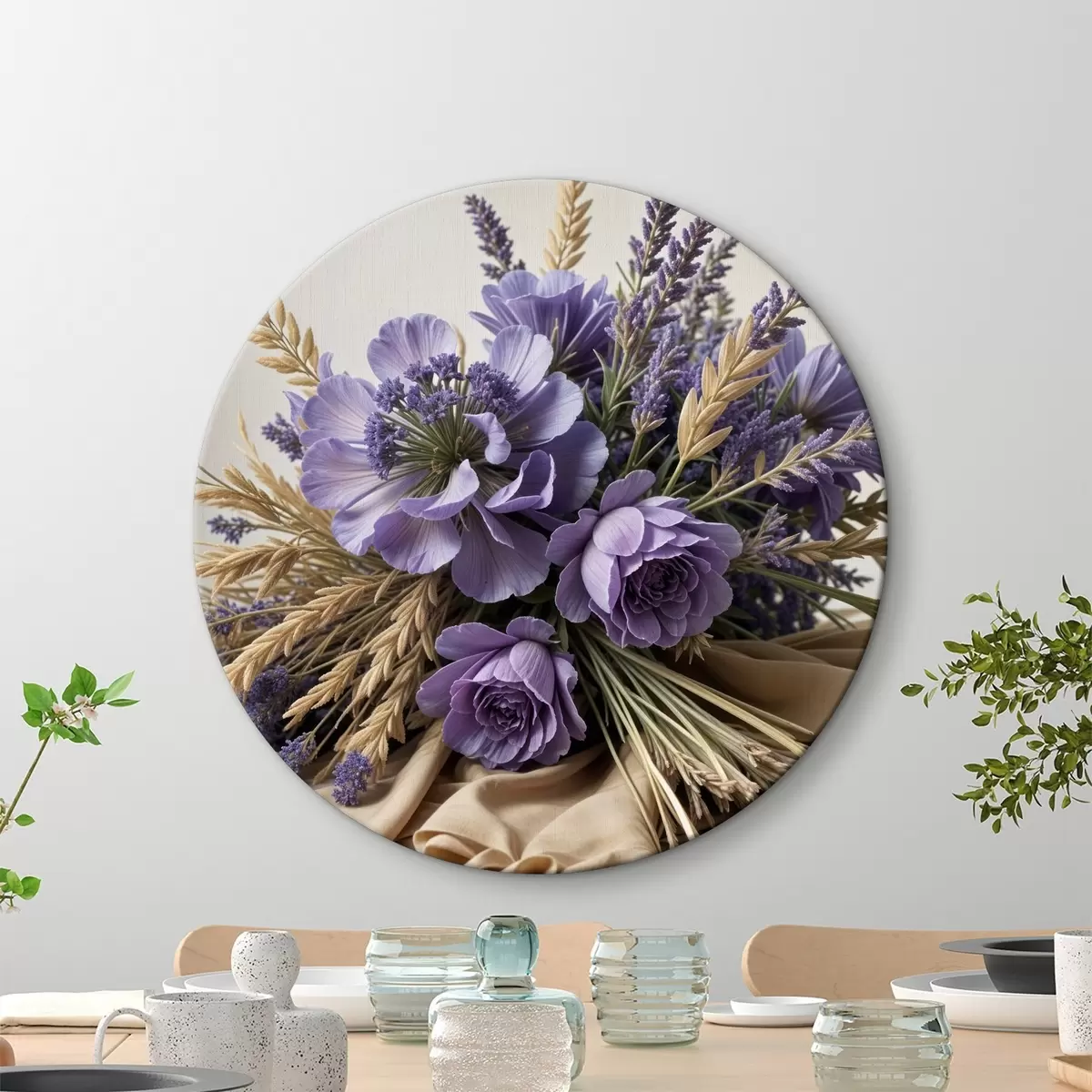Tableaux rondes Un bouquet de fleurs violettes, dont des pivoines et de la lavande, avec des tiges de blé sur un fond clair Nr r40030