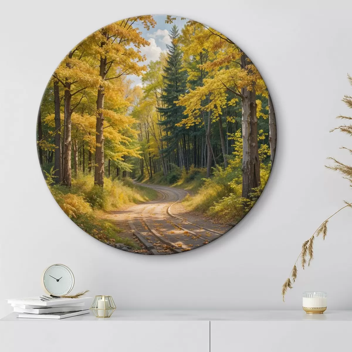Tableaux rondes Un chemin de terre serpentant à travers une forêt en automne, avec de grands arbres des deux côtés Nr r40031