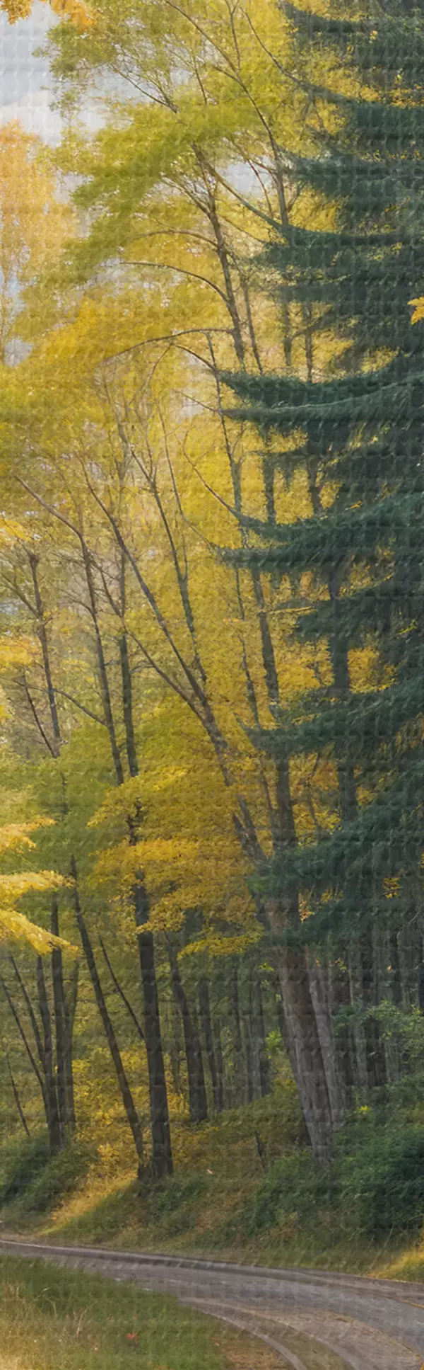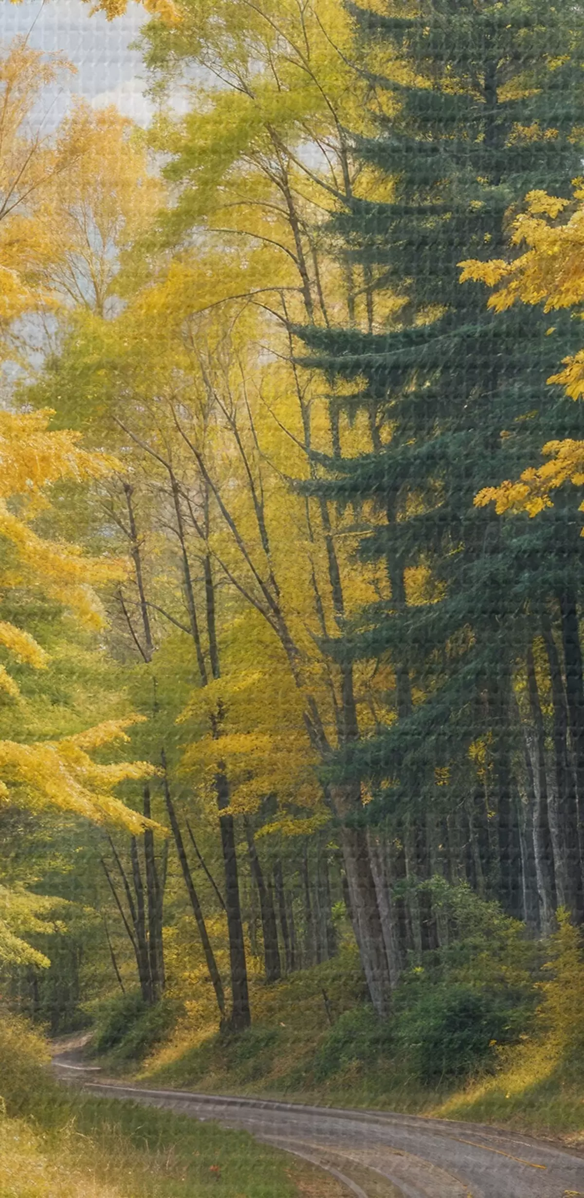 Tableaux rondes Un chemin de terre serpentant à travers une forêt en automne, avec de grands arbres des deux côtés r40031