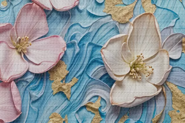 Tableaux rondes Fleurs vibrantes avec des pétales dans des tons de rose, jaune et bleu sur un fond texturé et abstrait r40034
