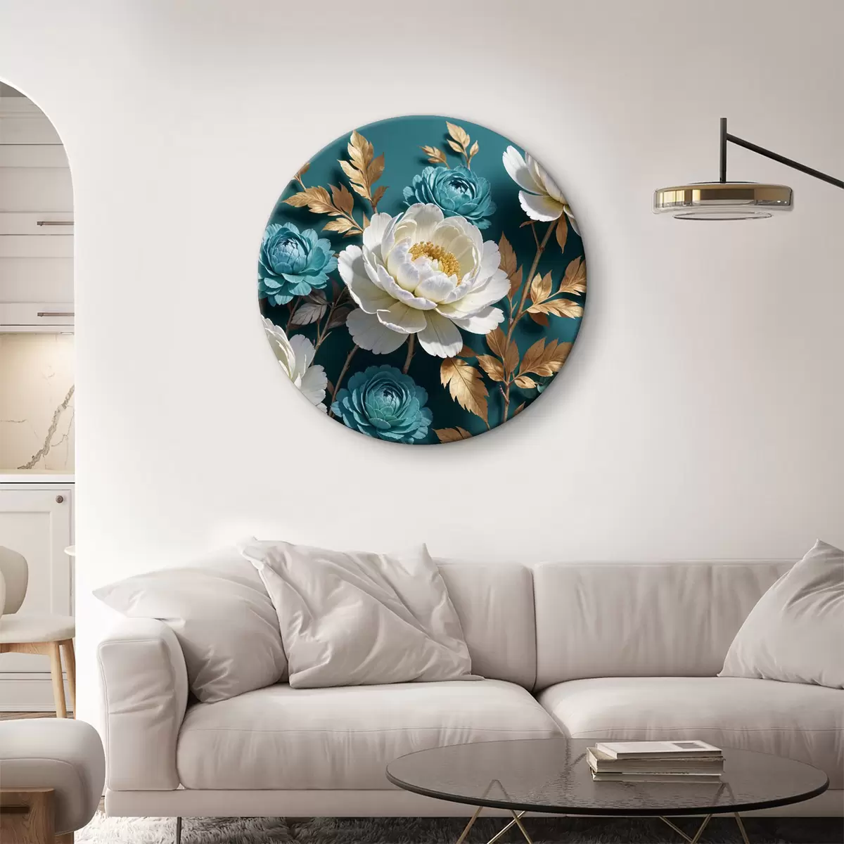 Tableaux rondes Un bouquet de grandes fleurs de pivoine blanches et bleu-vert avec des feuilles jaunes sur un fond bleu sarcelle Nr r40036