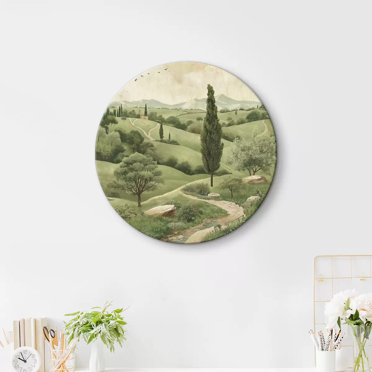 Tableaux rondes Paysage de Toscane, style vintage, couleurs vert pastel, collines et arbres r40075