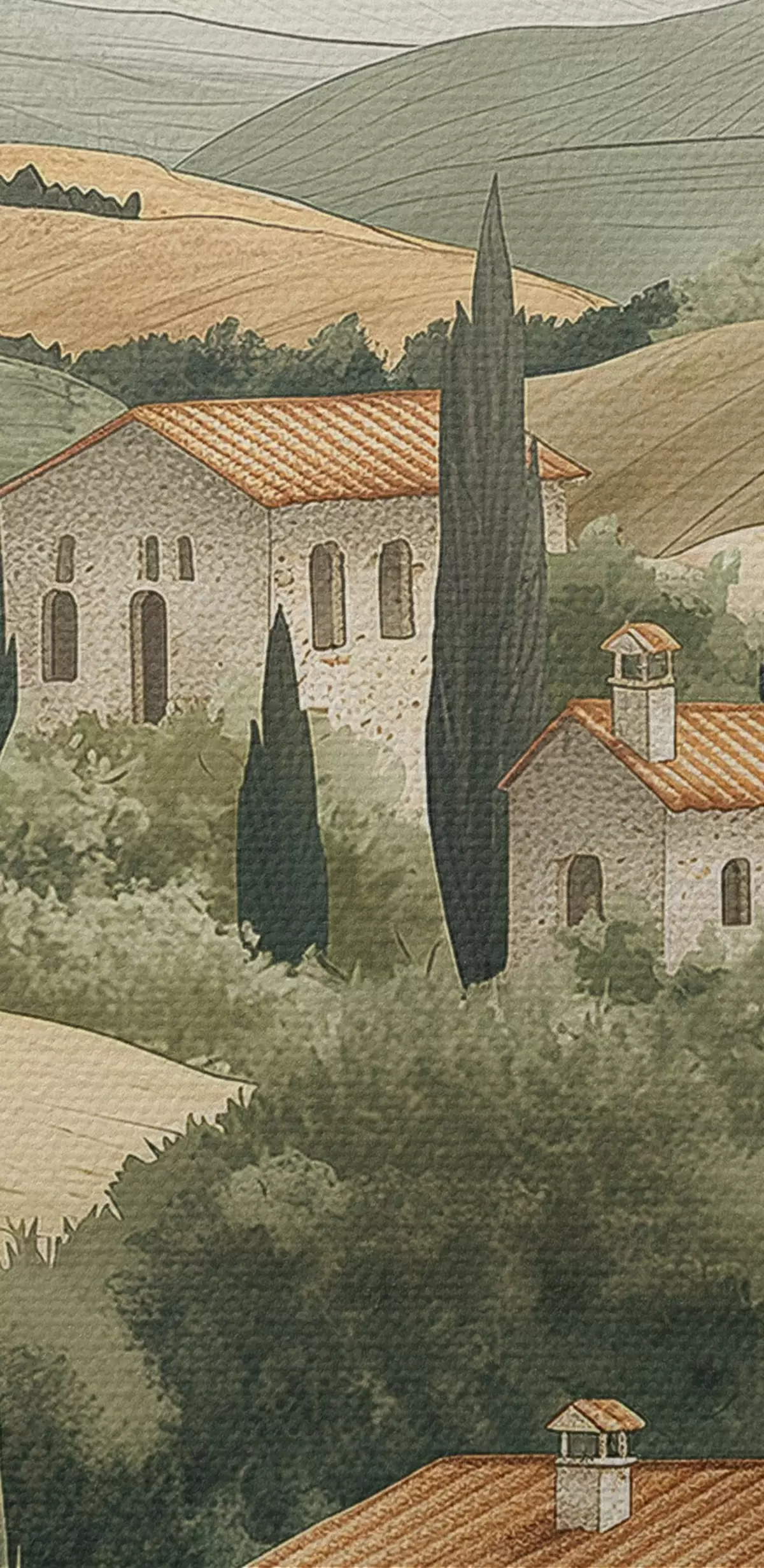 Tableaux rondes Paysage toscan avec maisons anciennes, couleurs pastel, collines et arbres, rustique Nr r40082