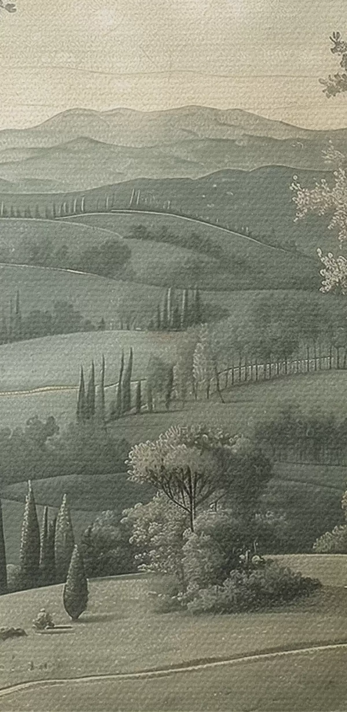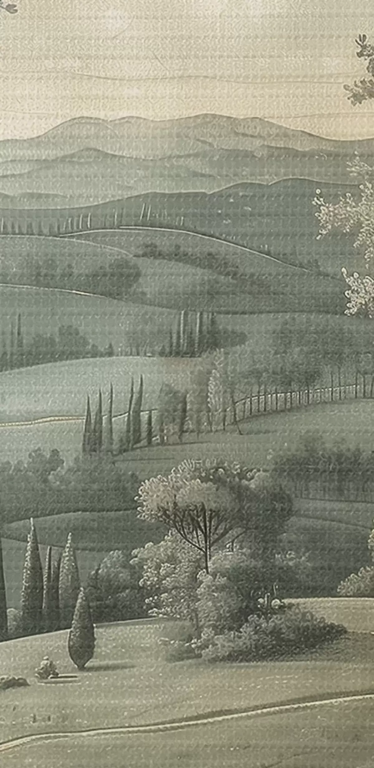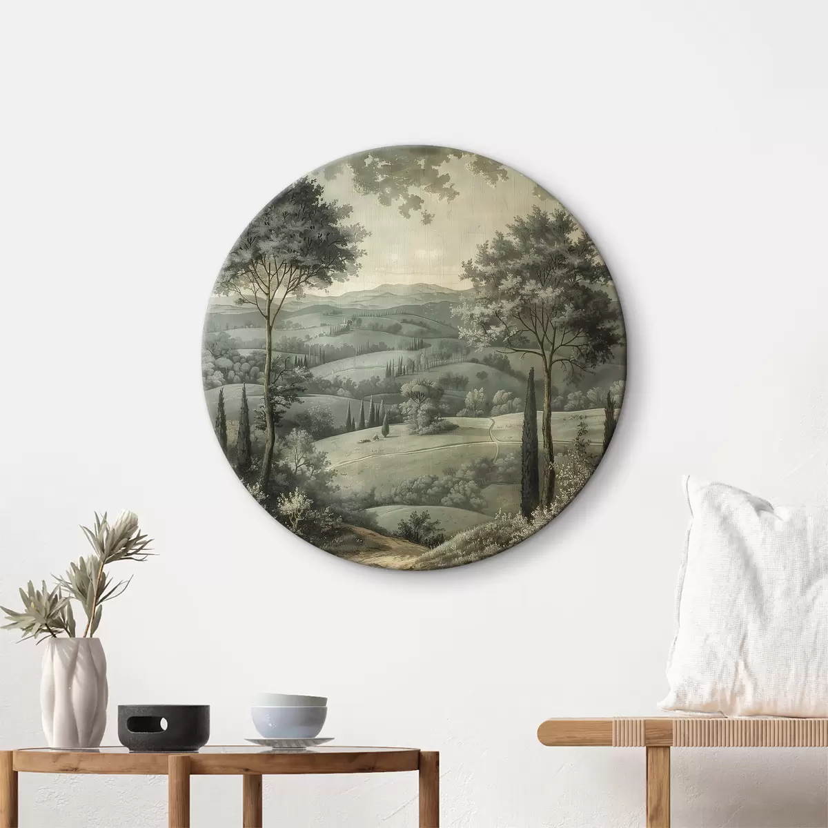 Tableaux rondes Paysage d'été vintage, style rustique, couleurs pastel, collines avec arbres, bohème r40087