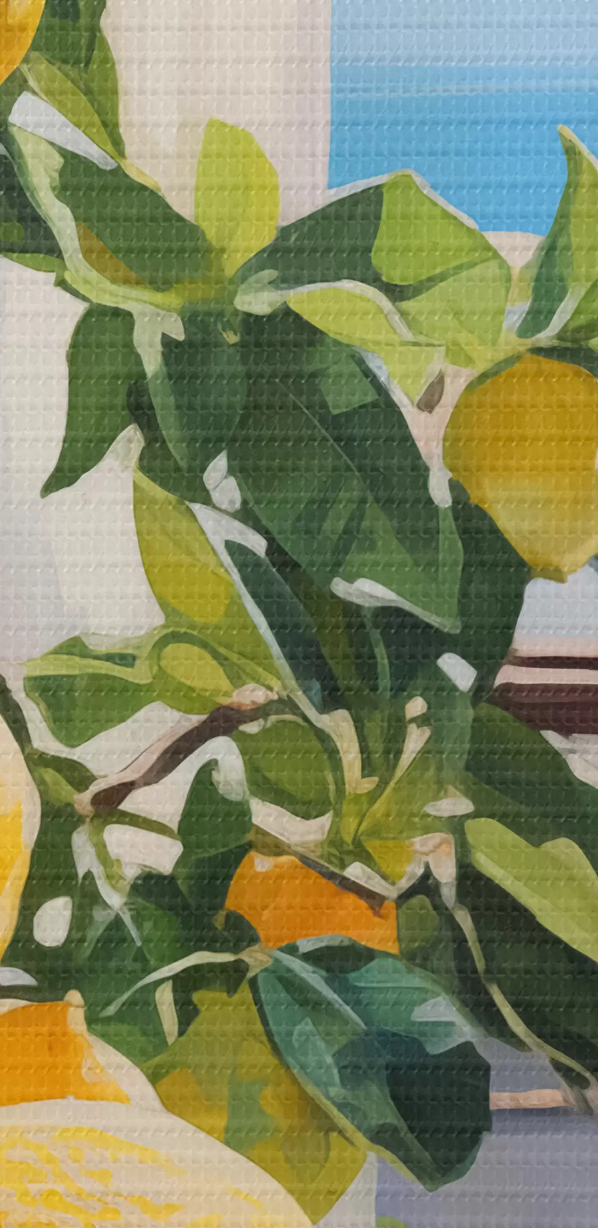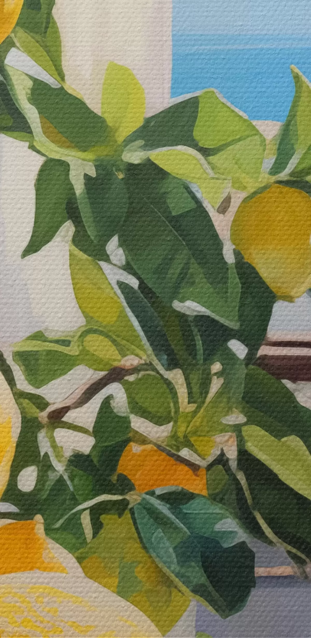 Tableaux rondes Citrons sur un arbre et une table sur un balcon d'hôtel avec vue sur la mer, imitation peinture à l'huile Nr r40091