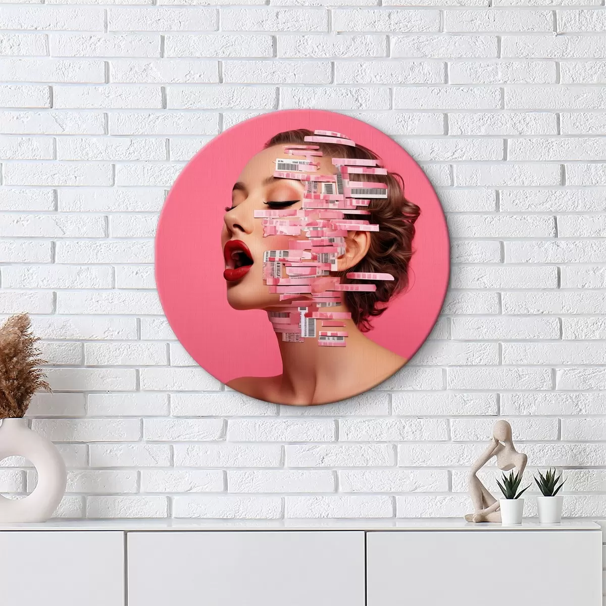 Tableaux rondes Portrait d'une fille aux lèvres rouges couvertes de codes-barres sur fond rose Nr r40101