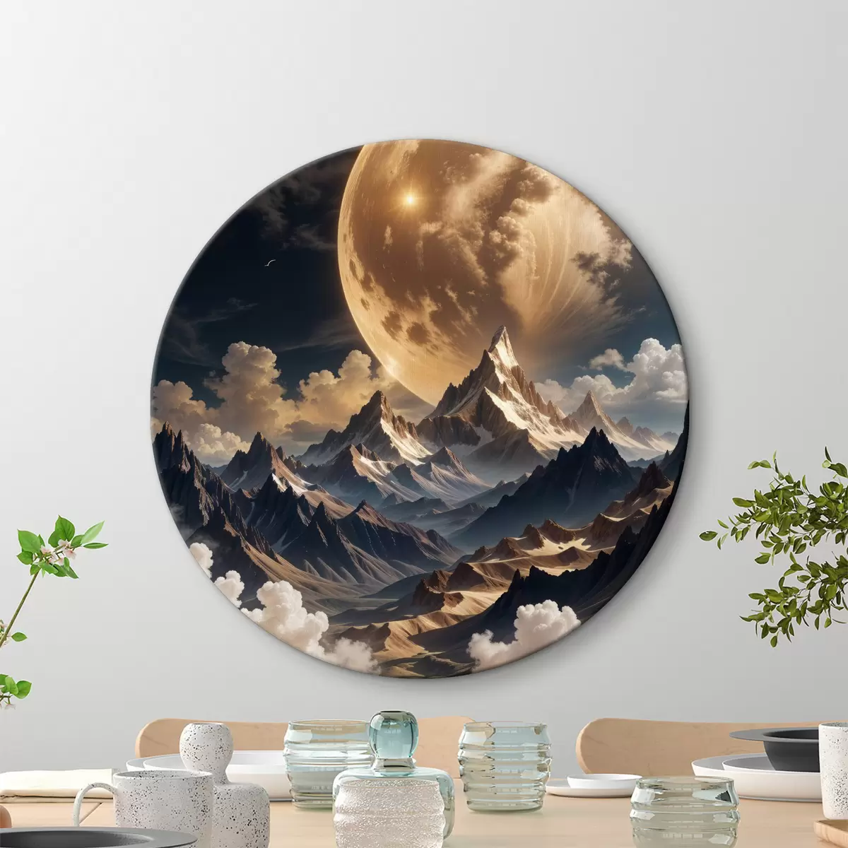 Tableaux rondes Un paysage surréaliste avec des montagnes enneigées sous une pleine lune massive, avec des nuages filamenteux Nr r40147