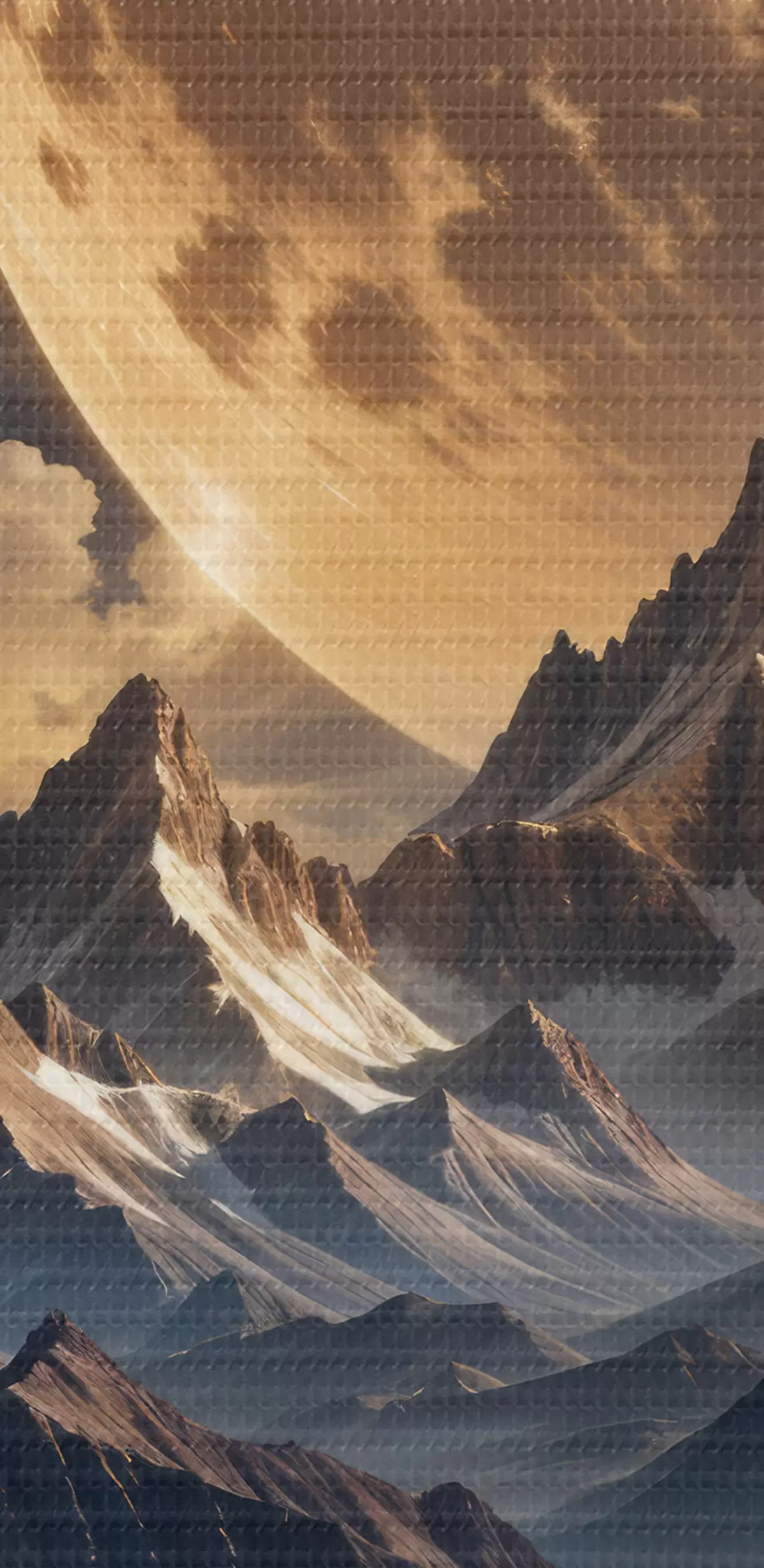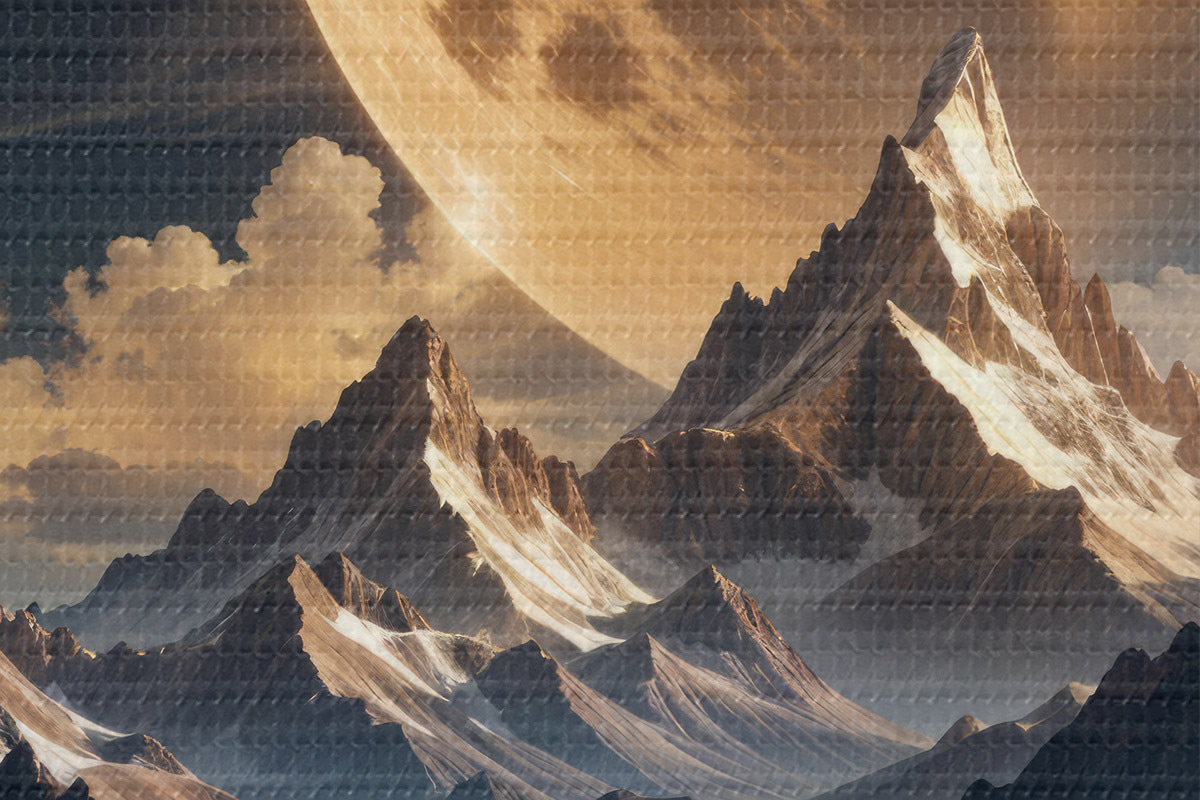 Tableaux rondes Un paysage surréaliste avec des montagnes enneigées sous une pleine lune massive, avec des nuages filamenteux r40147