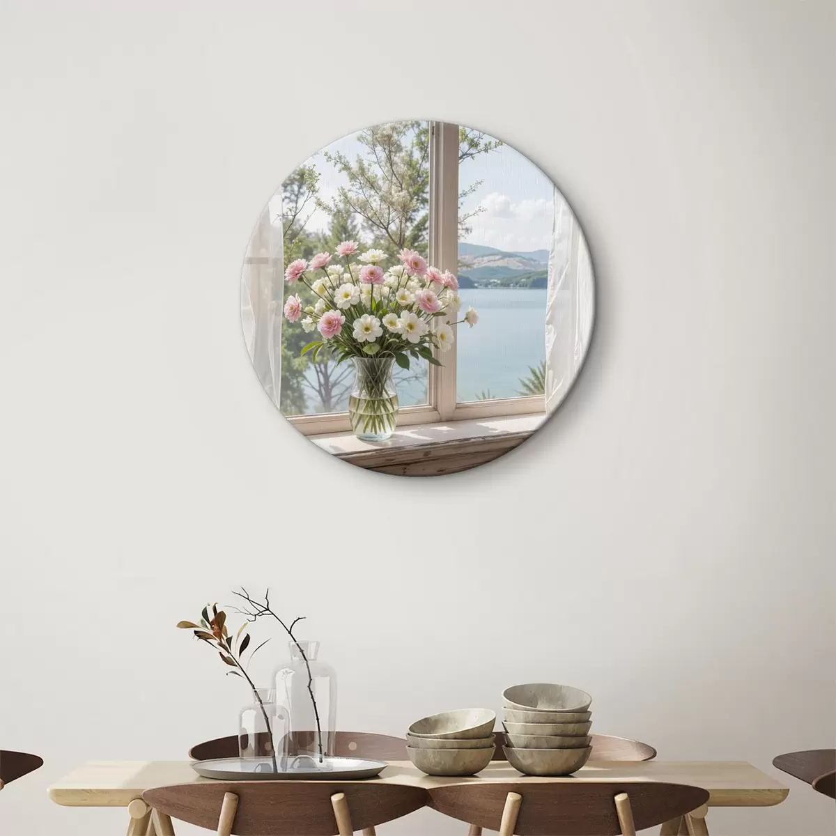 Tableaux rondes Un bouquet de fleurs roses et blanches dans un vase en verre placé sur un rebord de fenêtre, avec un lac et des montagnes pittoresques Nr r40151