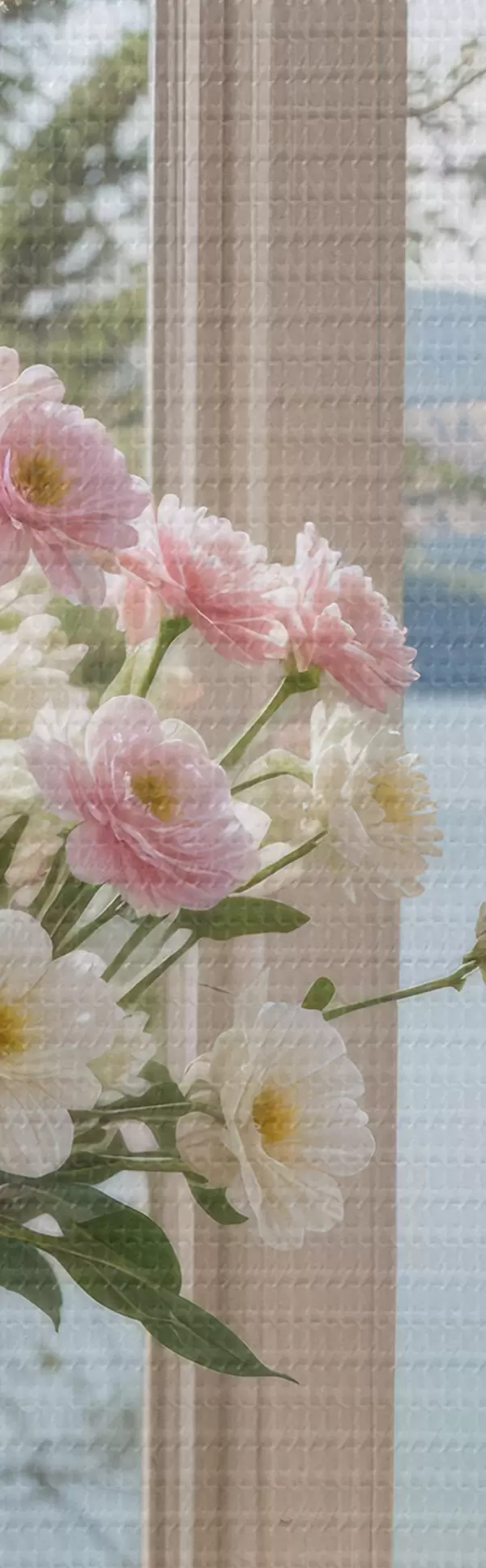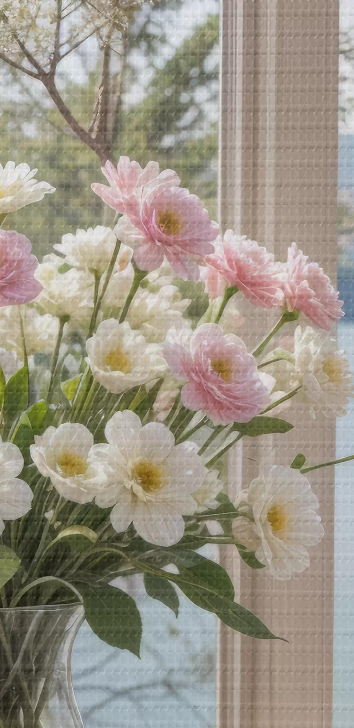 Tableaux rondes Un bouquet de fleurs roses et blanches dans un vase en verre placé sur un rebord de fenêtre, avec un lac et des montagnes pittoresques r40151