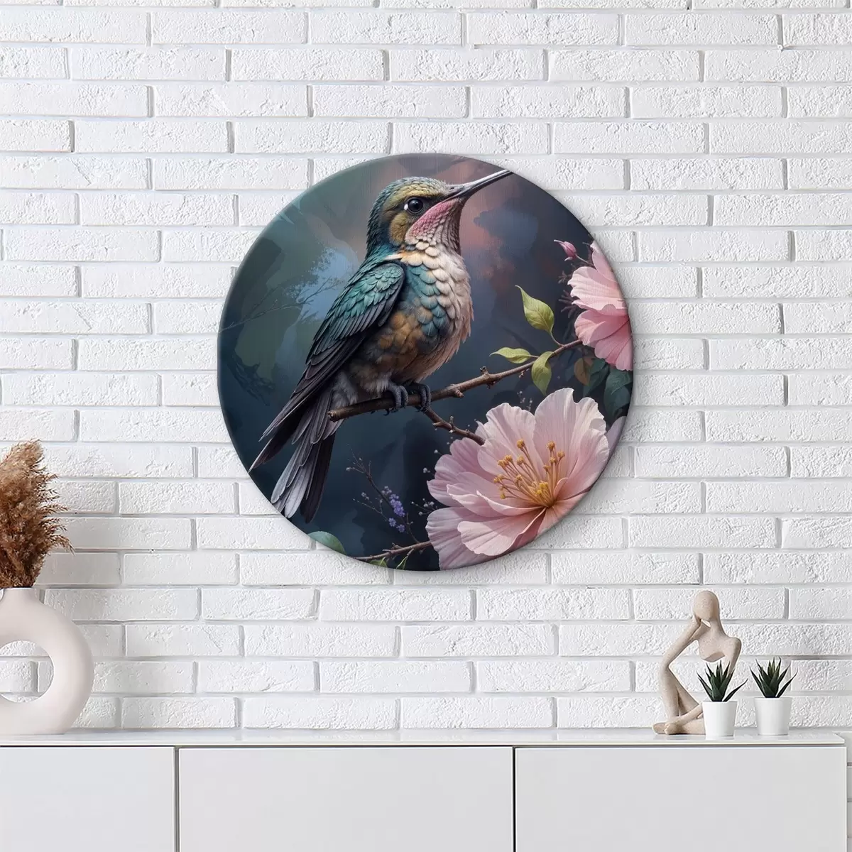 Tableaux rondes Un colibri coloré perché sur une branche avec des fleurs roses vibrantes en arrière-plan Nr r40155