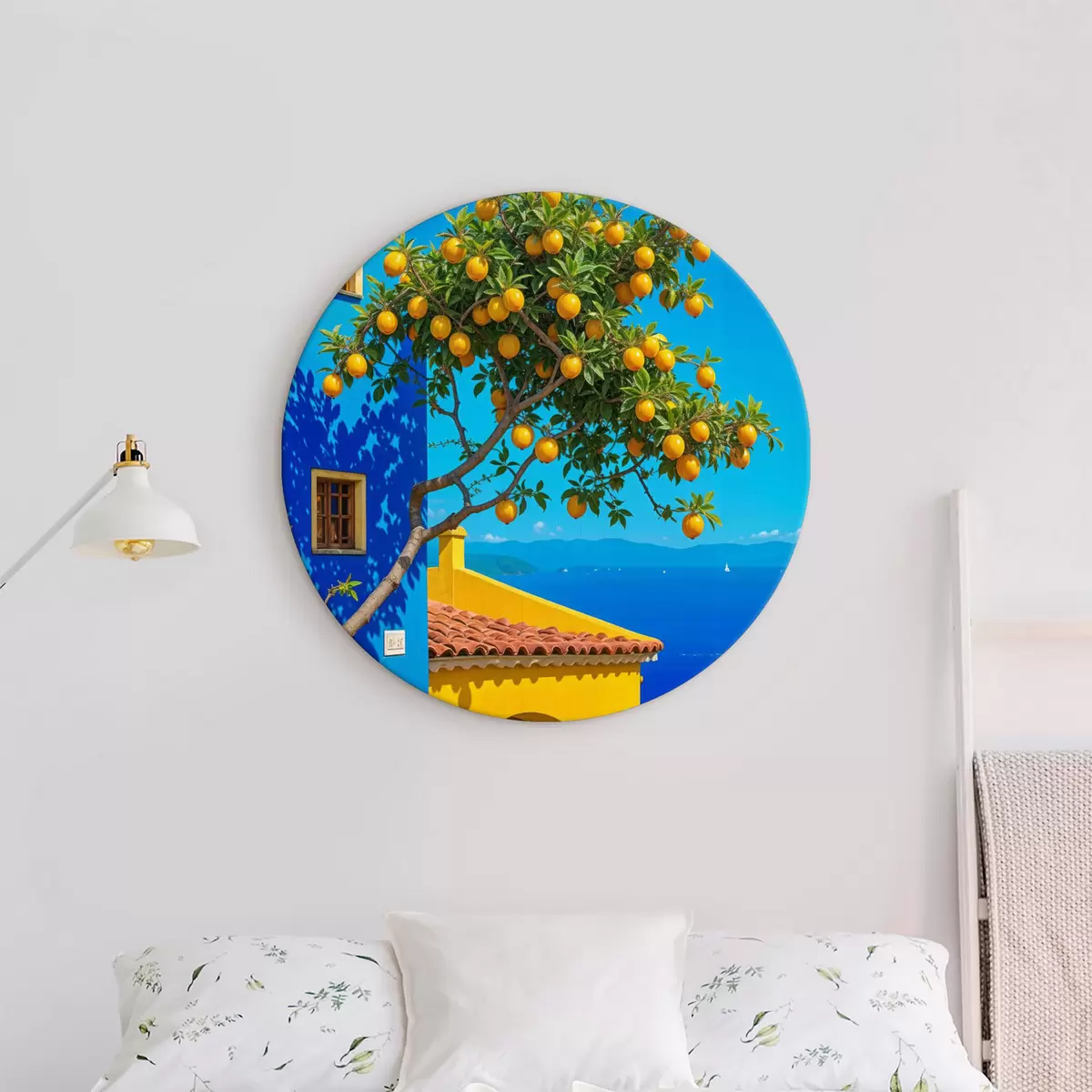 Tableaux rondes Un oranger aux fruits mûrs poussant sur un bâtiment avec un mur bleu et un toit de tuiles donnant sur l'océan Nr r40159