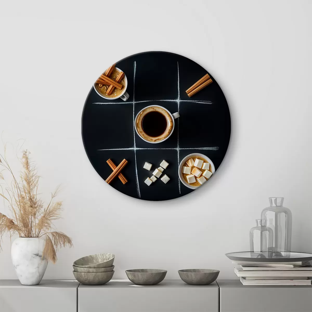 Tableaux rondes Une tasse de café avec des bâtons de cannelle, des morceaux de sucre et des guimauves disposés dans une grille de morpion r40163