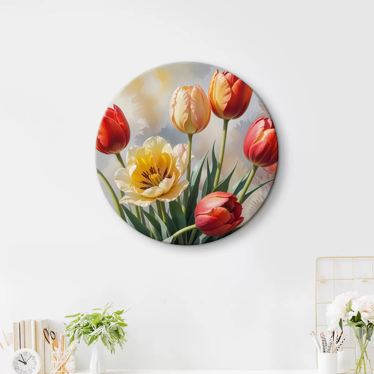 Tableaux rondes Tulipes colorées dans différentes nuances de rouge, d'orange et de jaune sur un fond clair Nr r40167