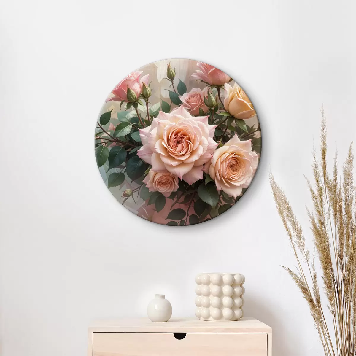 Tableaux rondes Un bouquet de belles roses roses avec des feuilles vertes sur un fond doux et flou Nr r40168