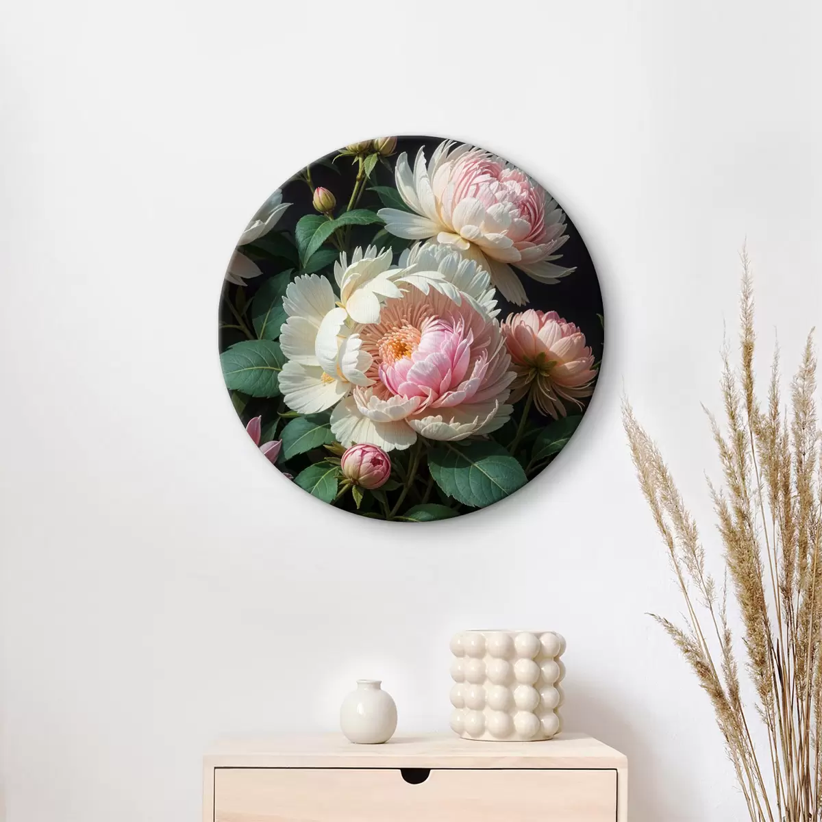 Tableaux rondes Fleurs de pivoine luxuriantes dans des tons de blanc, de rose et de jaune avec des pétales délicats et superposés et des feuilles vertes r40170