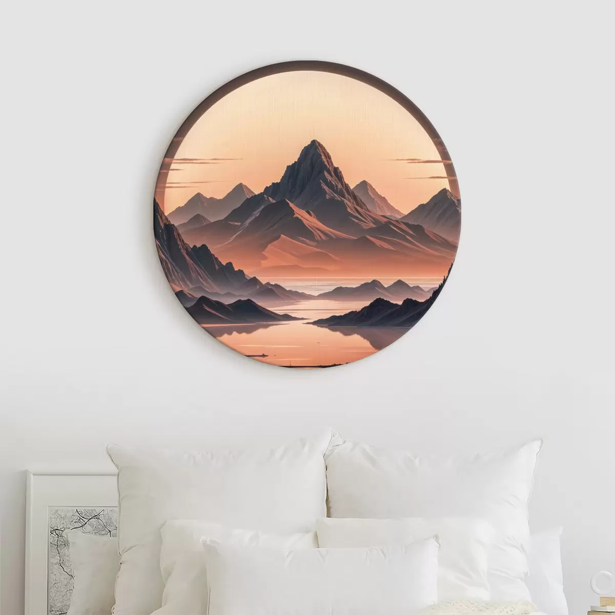 Tableaux rondes Un paysage futuriste et spectaculaire avec une grande lune ou un soleil brillant dans le ciel, entouré de montagnes r40177