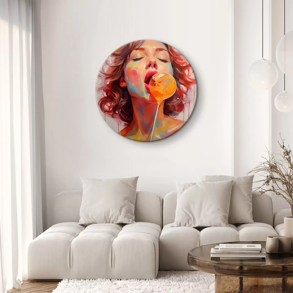 Tableaux rondes Une fille aux cheveux bouclés aux couleurs vives lèche une sucette Nr r40213