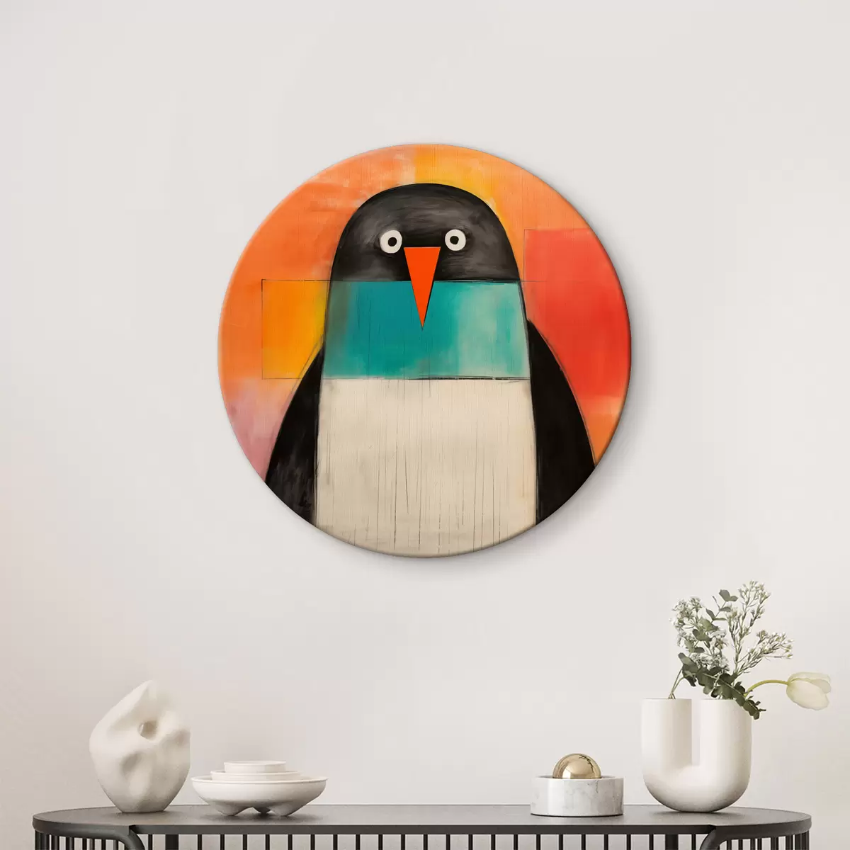 Tableaux rondes Pingouin sur fond rouge orange dessin plat Nr r40217