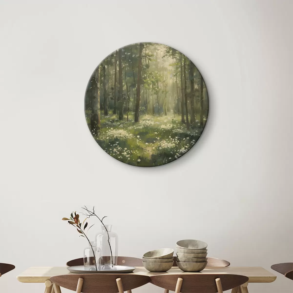 Tableaux rondes Forêt avec soleil dans les arbres, fleurs de camomille, herbe verte, dessin acrylique Nr r40226