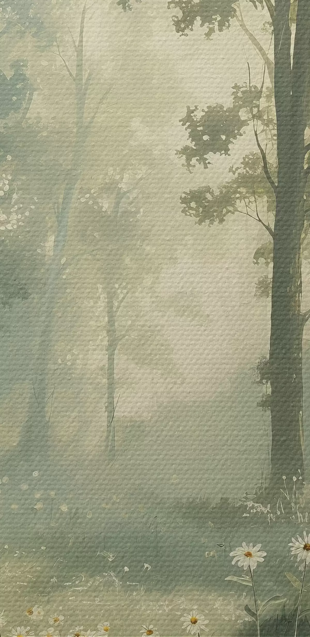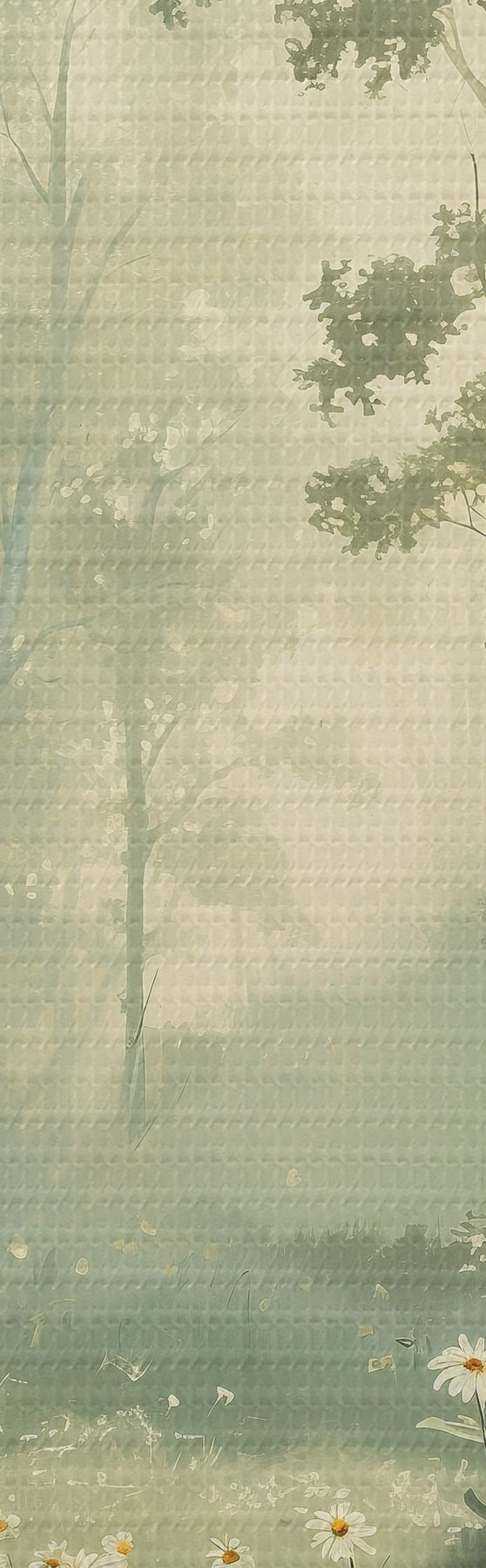 Tableaux rondes Forêt avec une douce lumière du soleil, fleurs de camomille, arbres, herbe verte, dessin acrylique Nr r40228