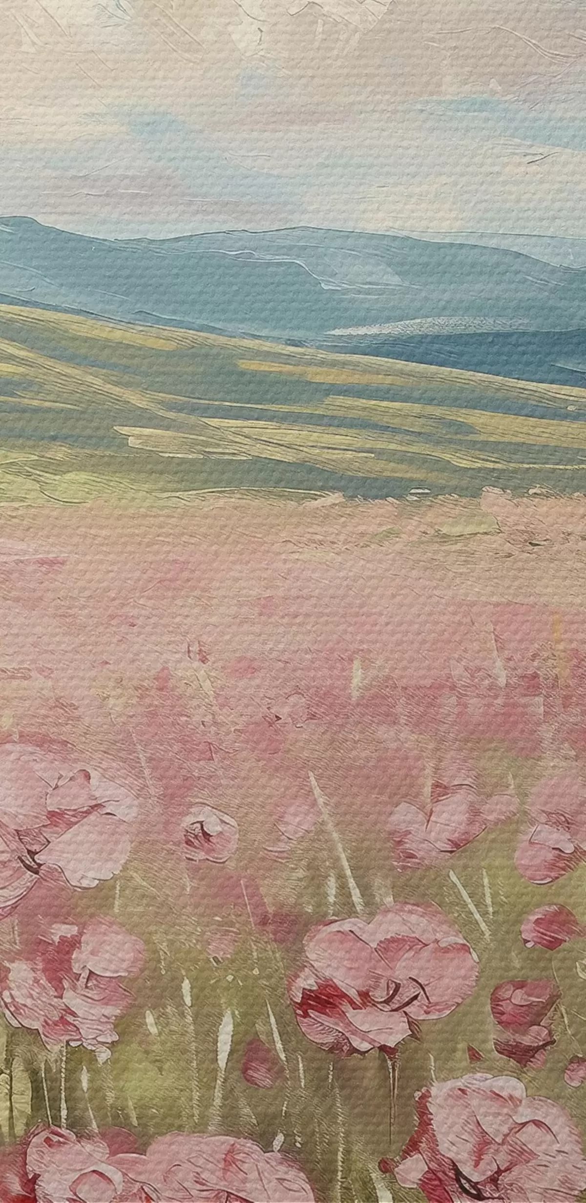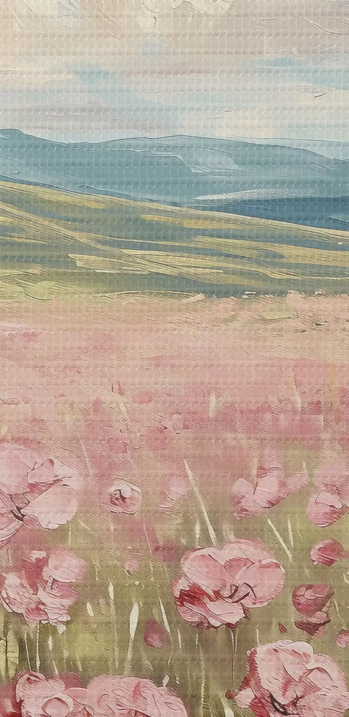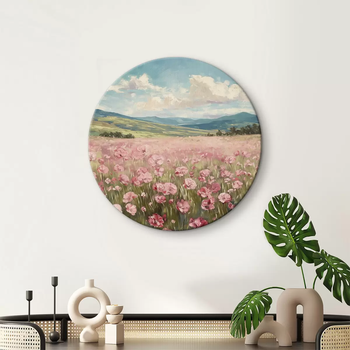 Tableaux rondes Prairie avec des fleurs roses, montagnes, paysage naturel, ciel bleu avec des nuages, acrylique Nr r40232