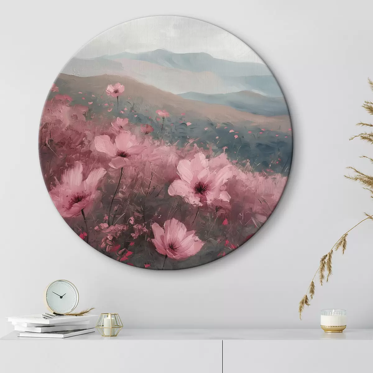 Tableaux rondes Fleurs roses dans le pré, paysage naturel, montagnes, peinture à l'huile, coups de pinceau vifs Nr r40233