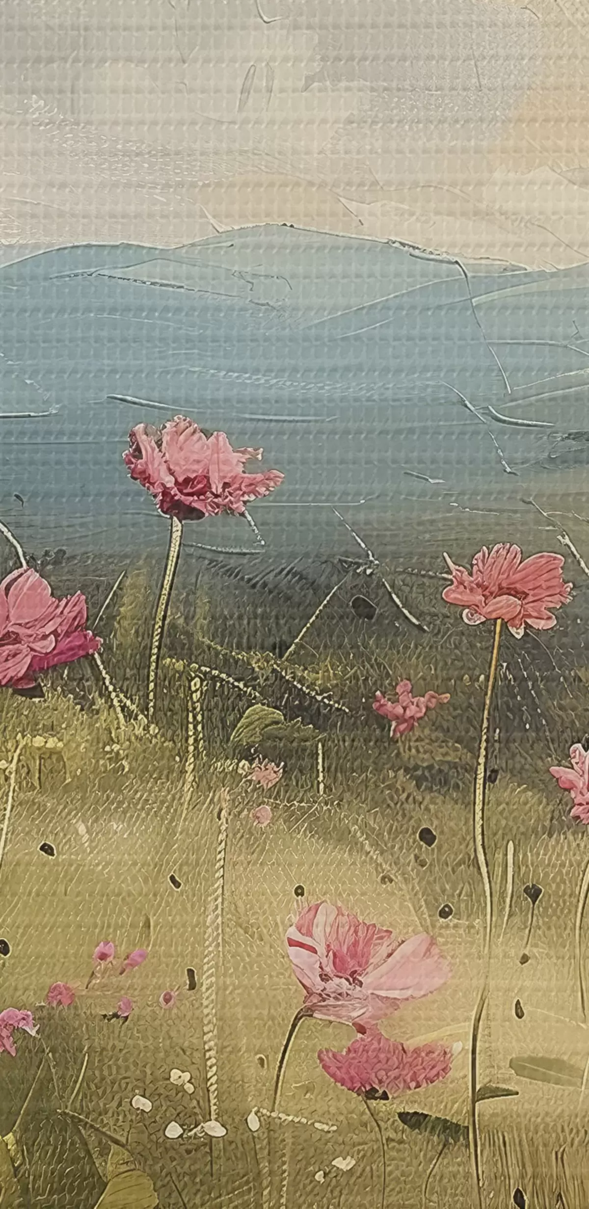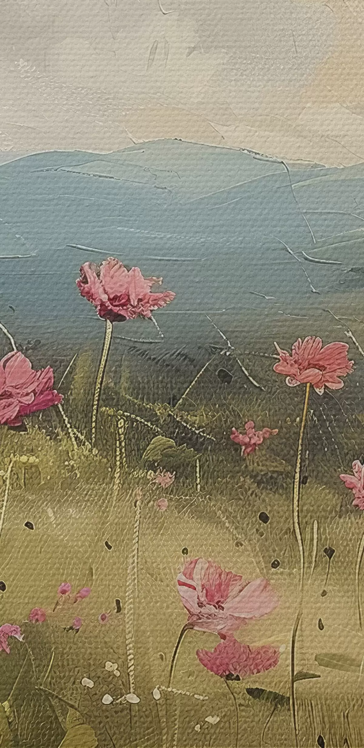 Tableaux rondes Prairie avec des fleurs roses, herbe verte, paysage naturel, ciel avec nuages, dessin acrylique Nr r40234