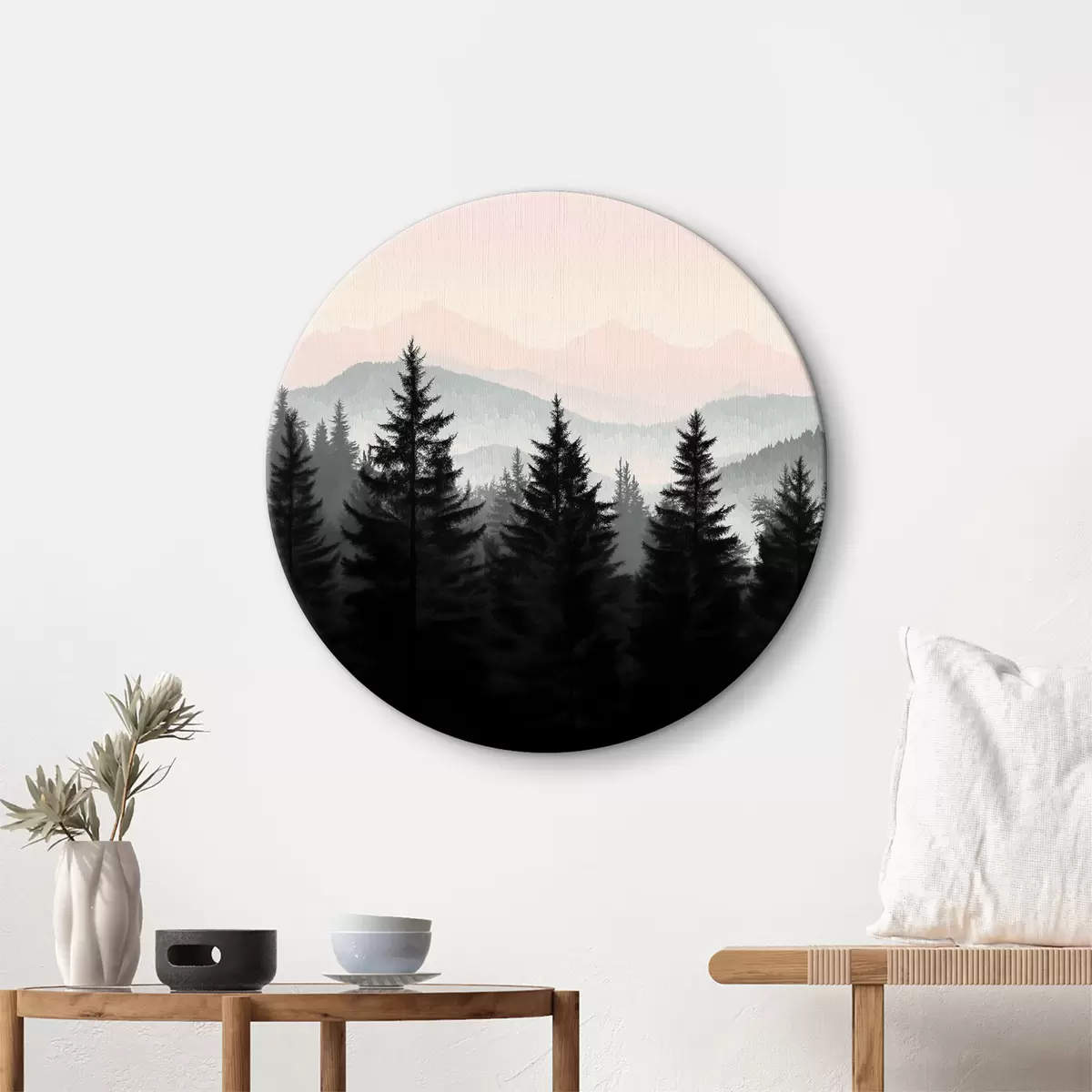 Tableaux rondes Forêt avec montagnes en arrière-plan Nr r40281