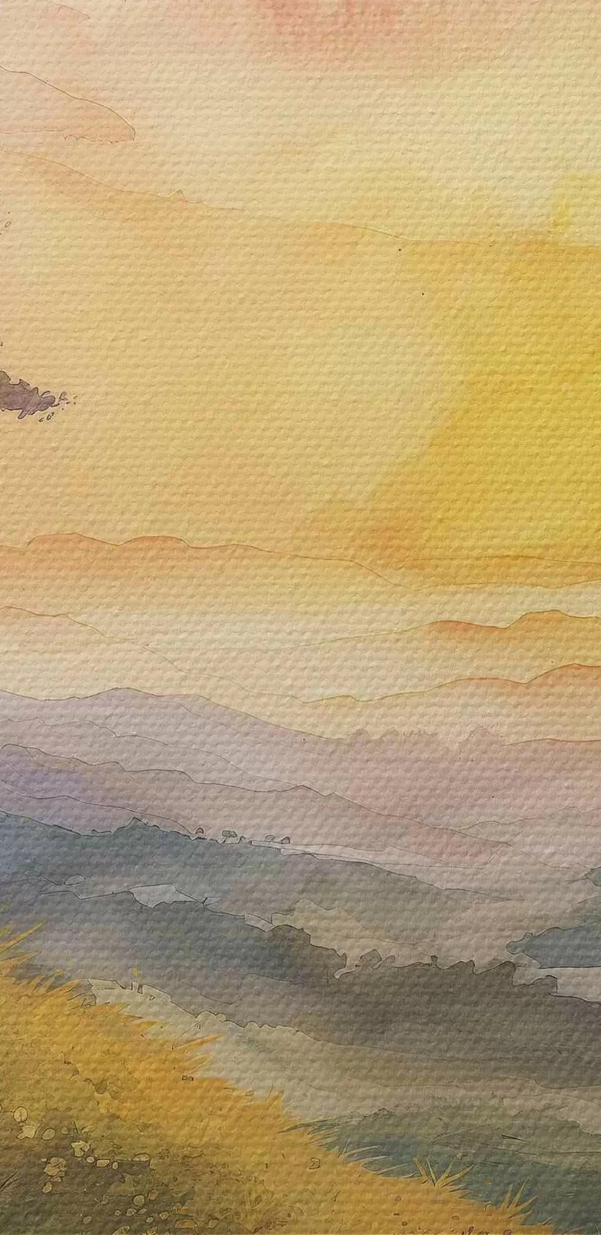 Tableaux rondes Prairie avec collines et arbres, fleurs, aquarelle Nr r40303