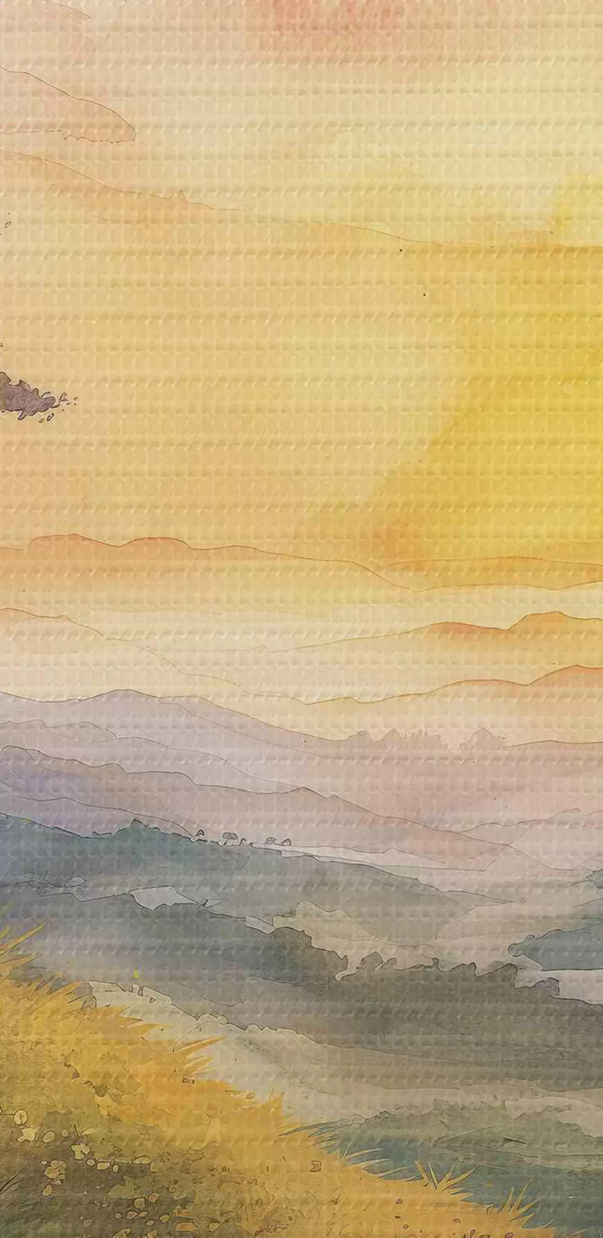 Tableaux rondes Prairie avec collines et arbres, fleurs, aquarelle r40303