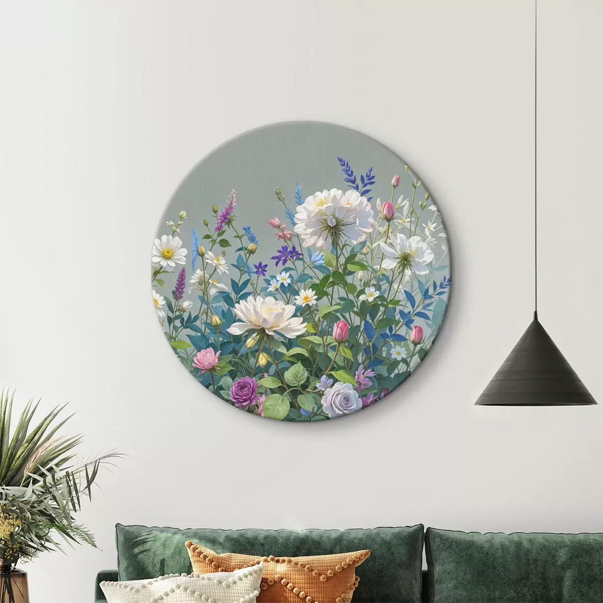 Tableaux rondes Un jardin luxuriant et dynamique rempli d'une variété de fleurs colorées et de plantes fleuries sur un fond gris Nr r40393