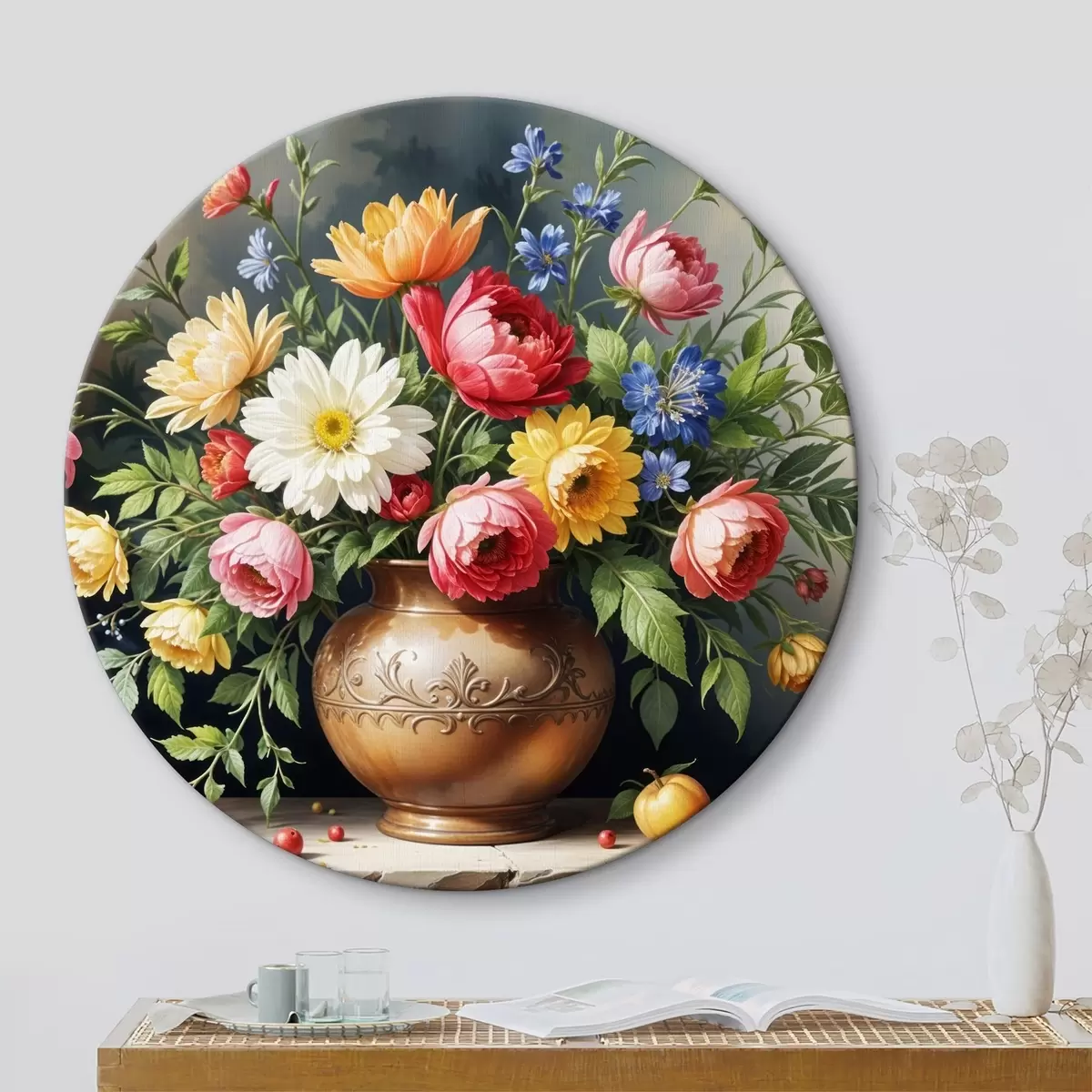 Tableaux rondes Une peinture vibrante d'un bouquet de fleurs colorées comprenant des roses rouges, des jonquilles jaunes et des marguerites blanches Nr r40395