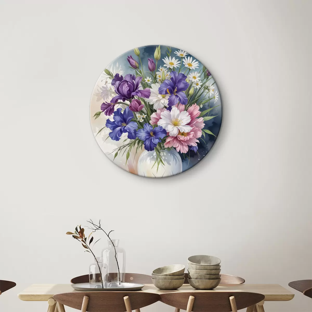 Tableaux rondes Un bouquet vibrant d'iris violets colorés, de marguerites roses et d'autres fleurs disposées dans un vase blanc Nr r40407