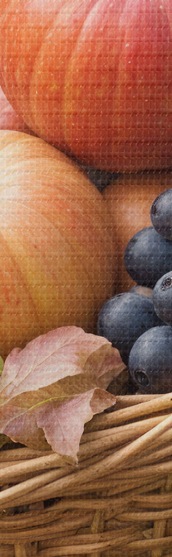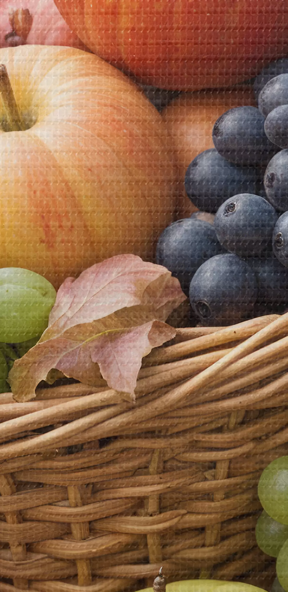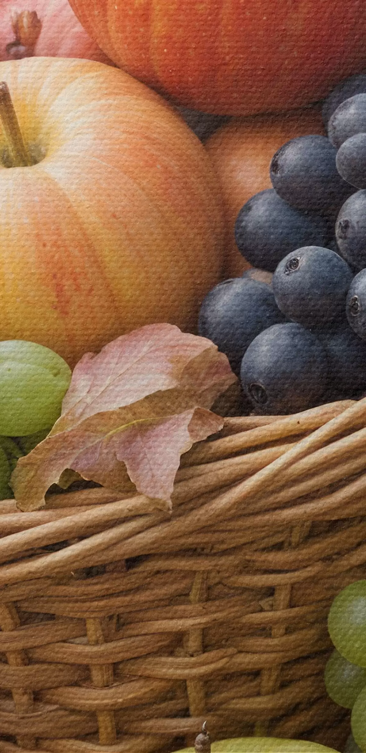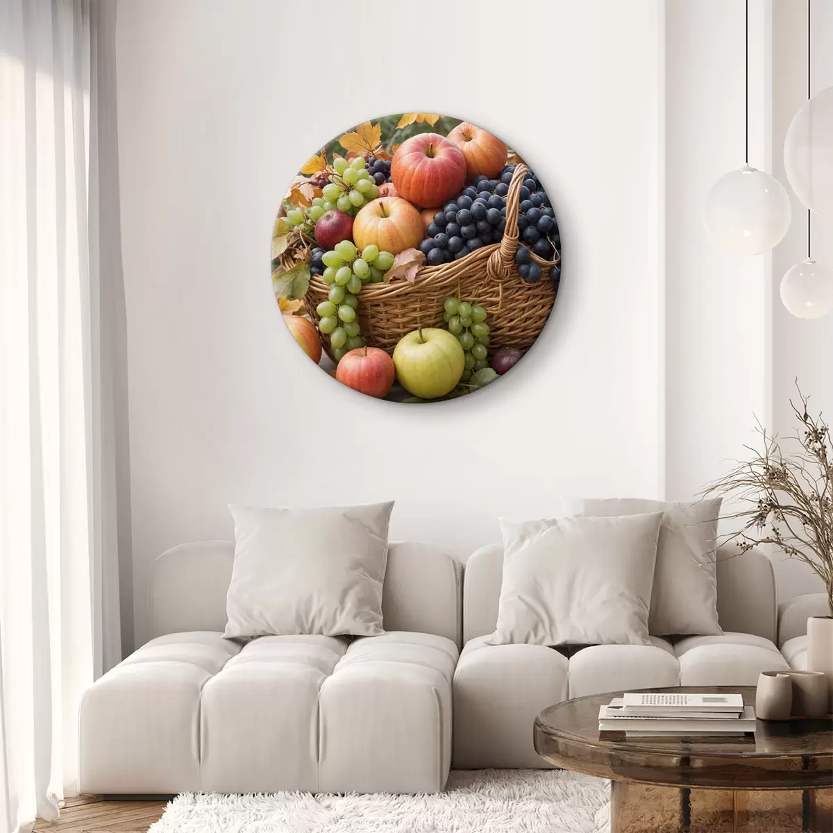 Tableaux rondes Un panier rempli de divers fruits d'automne, notamment des pommes, des raisins et des poires, entouré de feuilles mortes Nr r40409