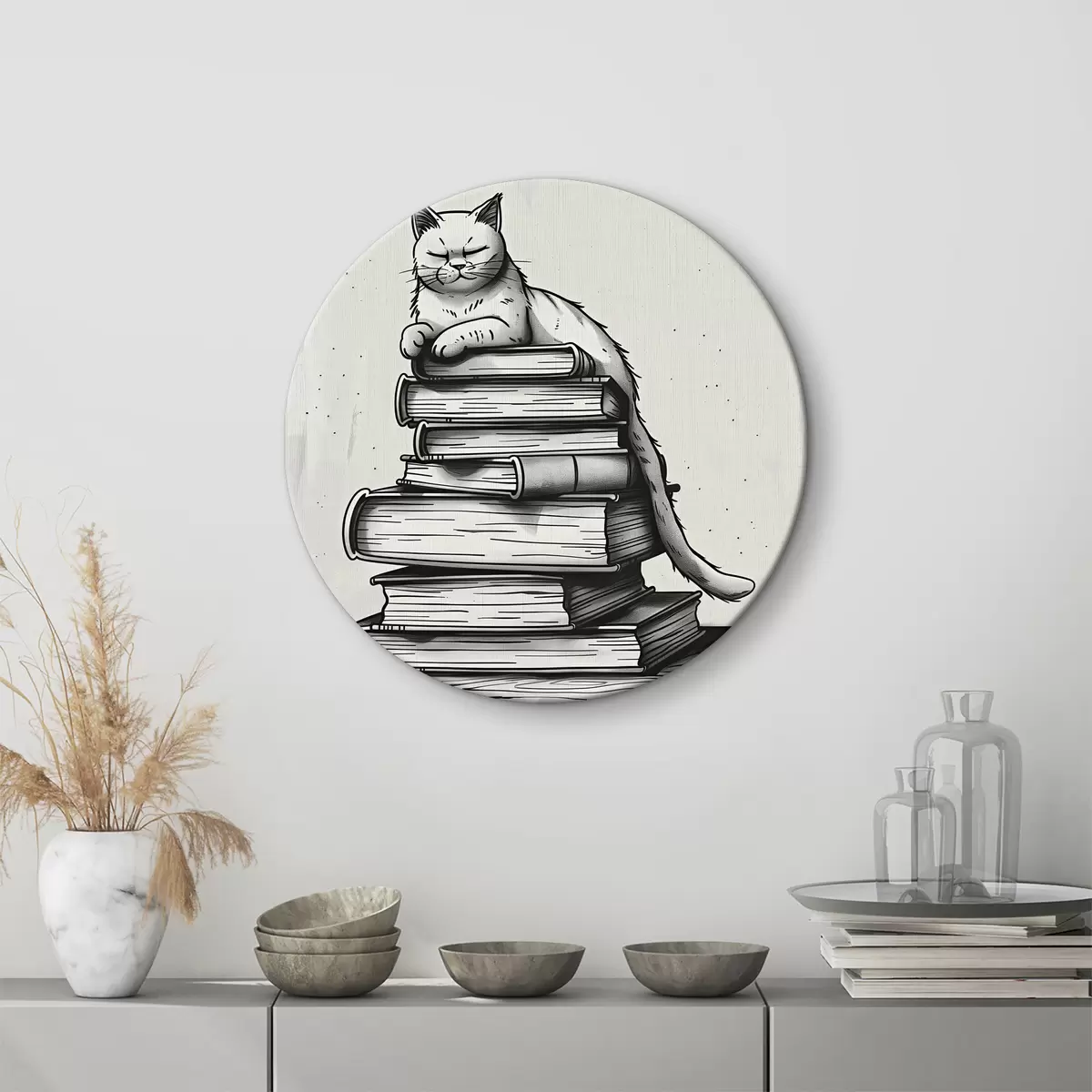Tableaux rondes Chat noir et blanc sur une pile de livres Nr r40435