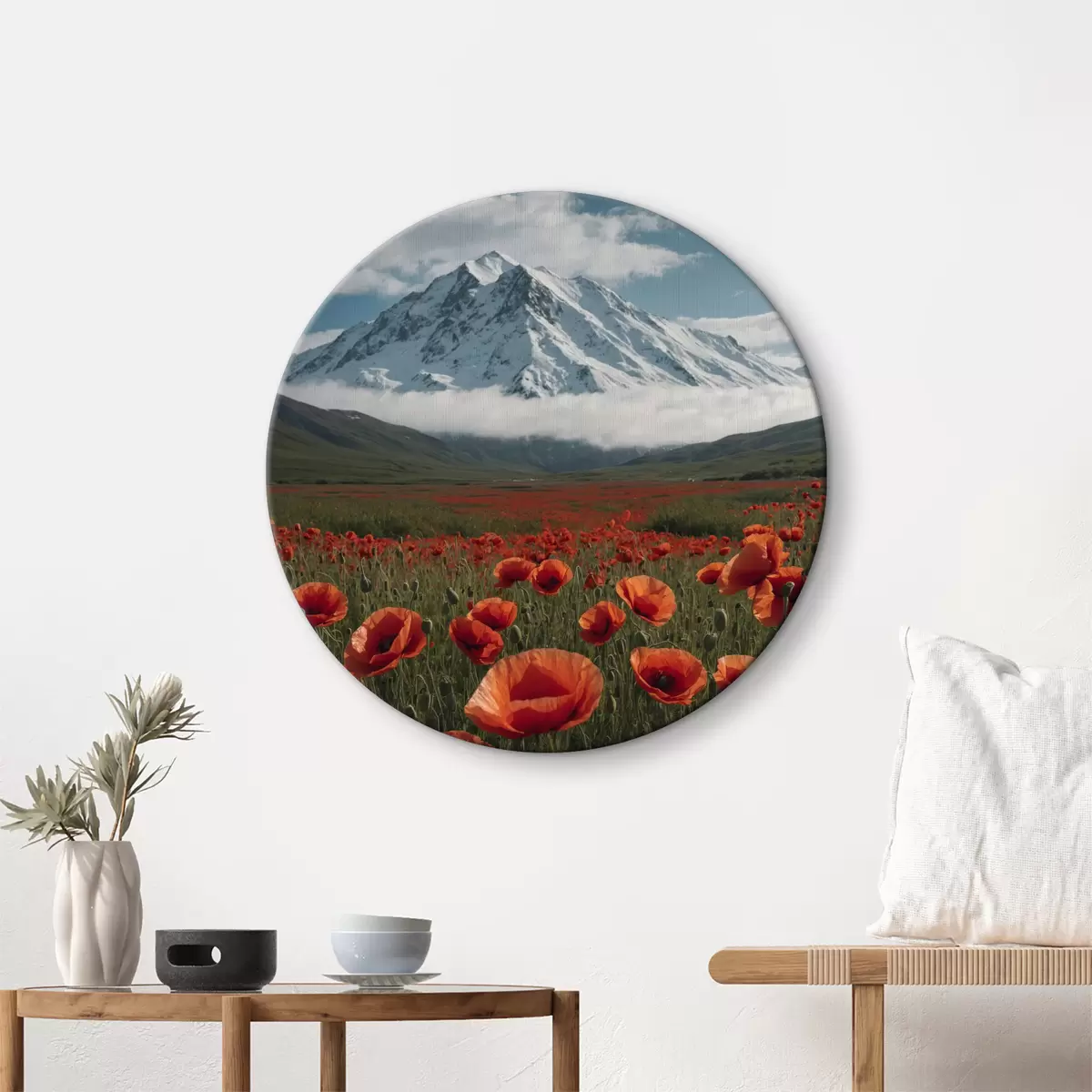 Tableaux rondes Un champ de coquelicots sur fond de montagnes enneigées Nr r40469