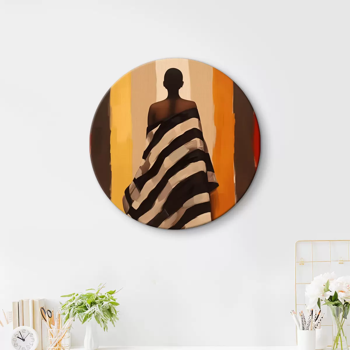 Tableaux rondes Silhouette d'une femme afro-américaine en cape rayée sur fond à rayures verticales, noir, beige, jaune, rouge, marron Nr r40487