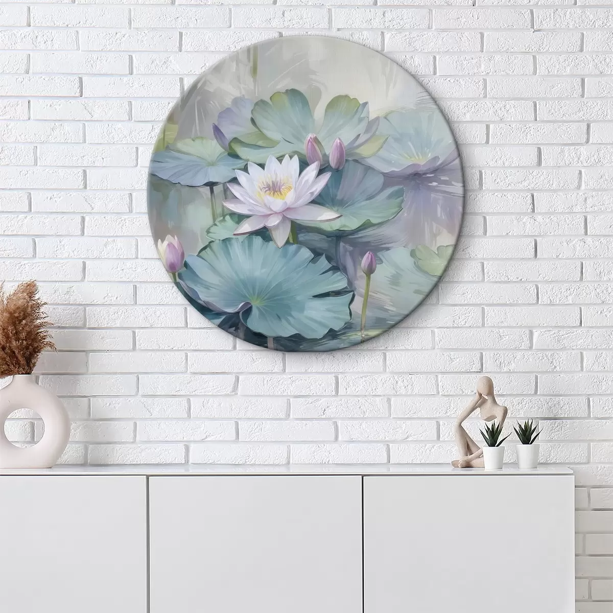 Tableaux rondes Image paisible d'un étang avec des nénuphars et des fleurs aux couleurs pastel, entouré de feuilles de nénuphars vertes et luxuriantes r40542