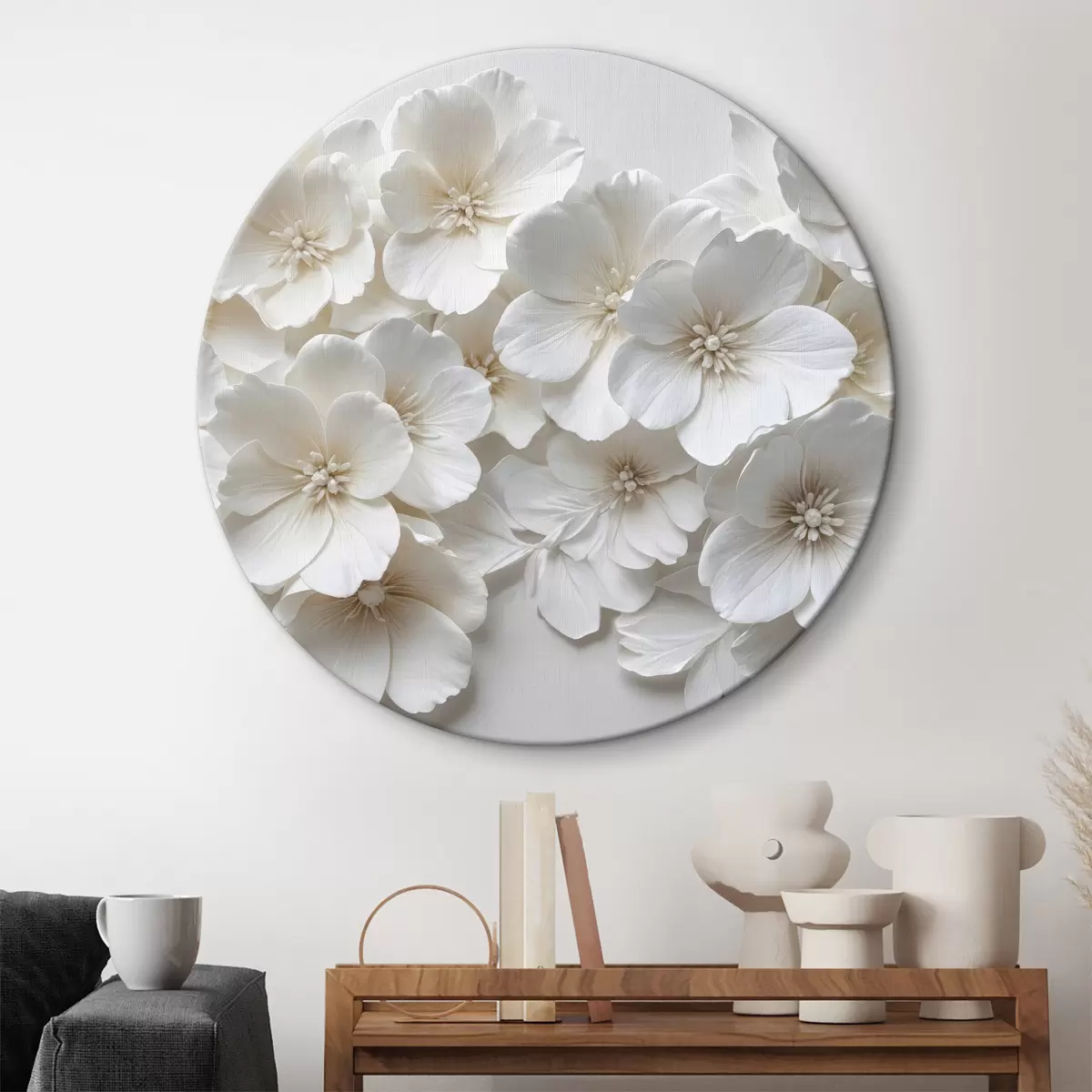 Tableaux rondes Fleurs blanches aux pétales délicats disposées selon un magnifique motif floral sur un fond clair Nr r40548