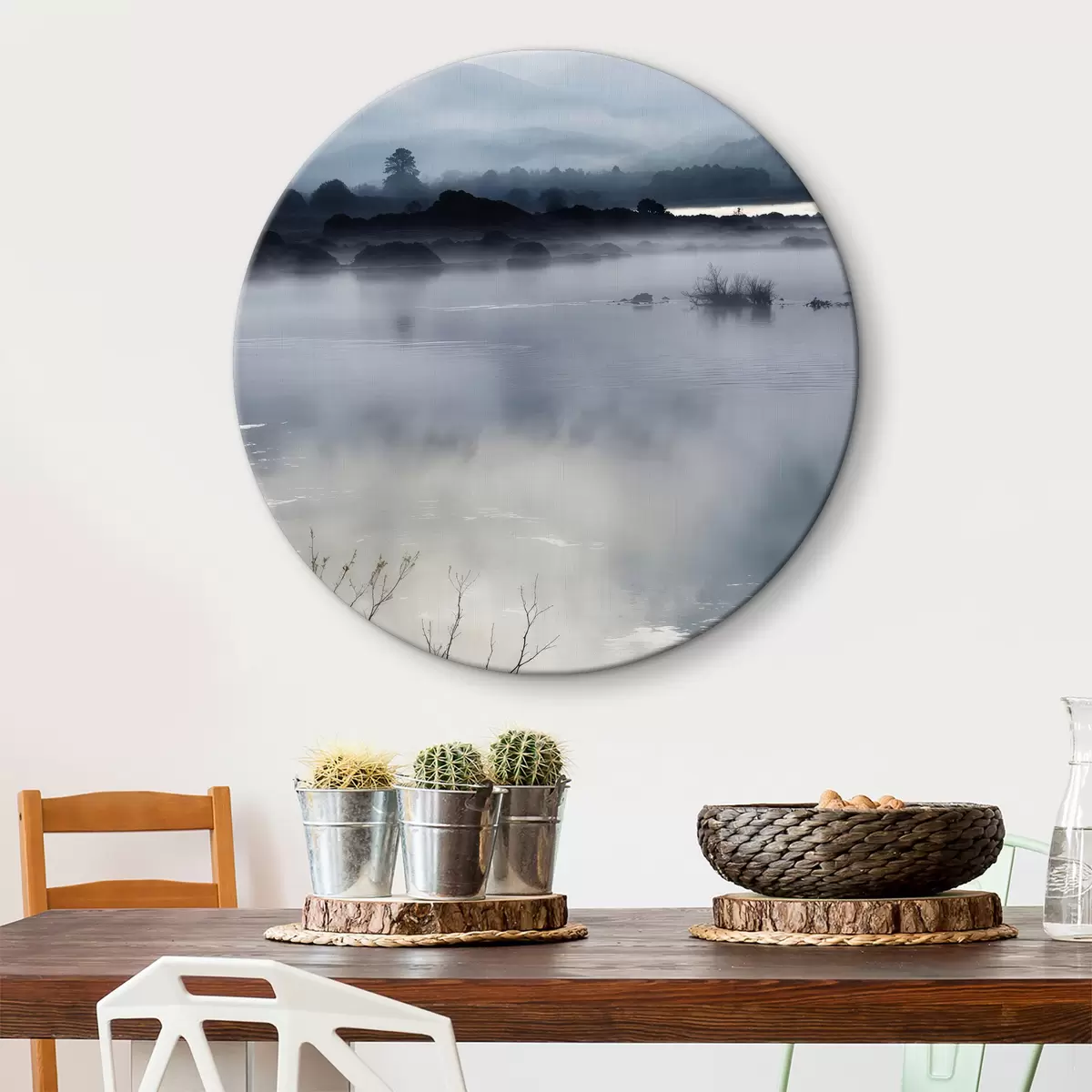 Tableaux rondes Un lac brumeux entouré de silhouettes de collines et d'arbres en arrière-plan, avec une surface calme et réfléchissante Nr r40552